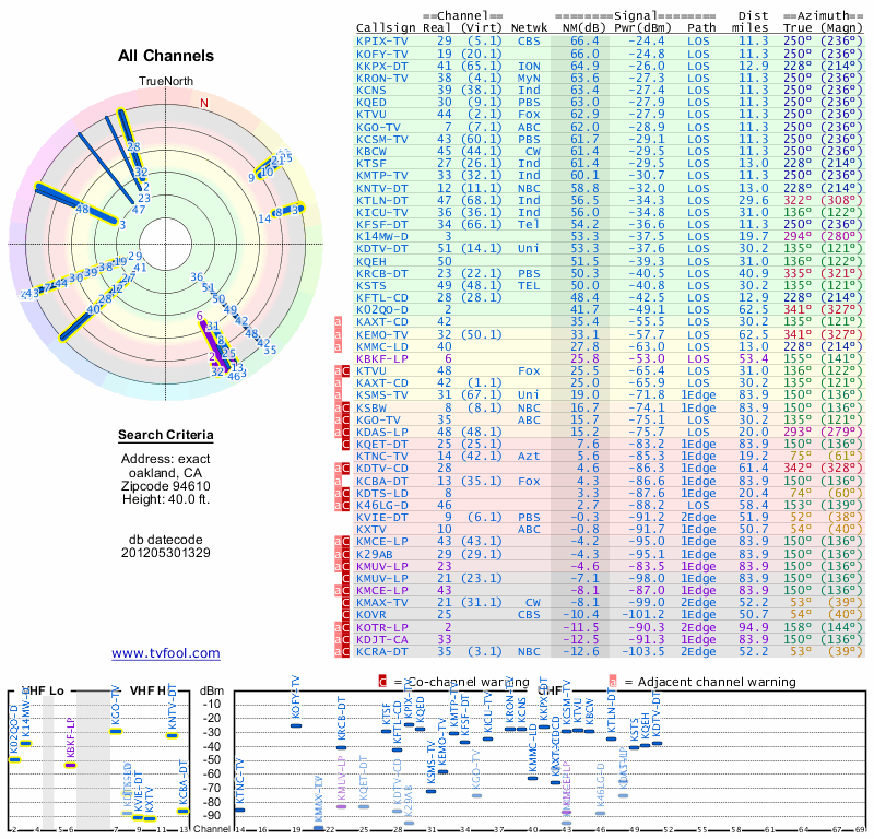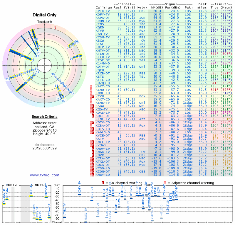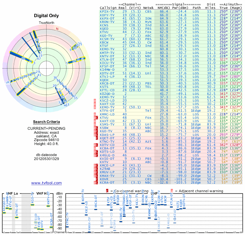 Here are the results for your location. The transmitter database was last updated on June 7, 2013. For more information about these plots and how to interpret them, please check out the Signal Analysis FAQ.