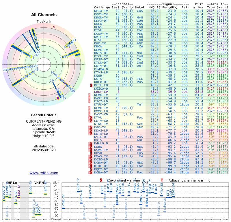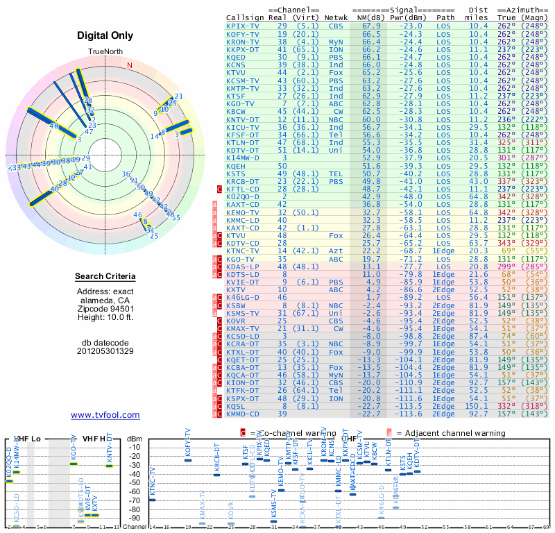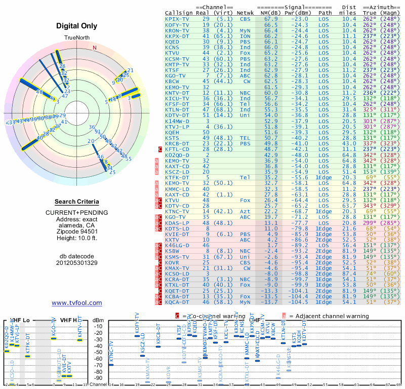 Here are the results for your location. The transmitter database was last updated on June 7, 2013. For more information about these plots and how to interpret them, please check out the Signal Analysis FAQ.