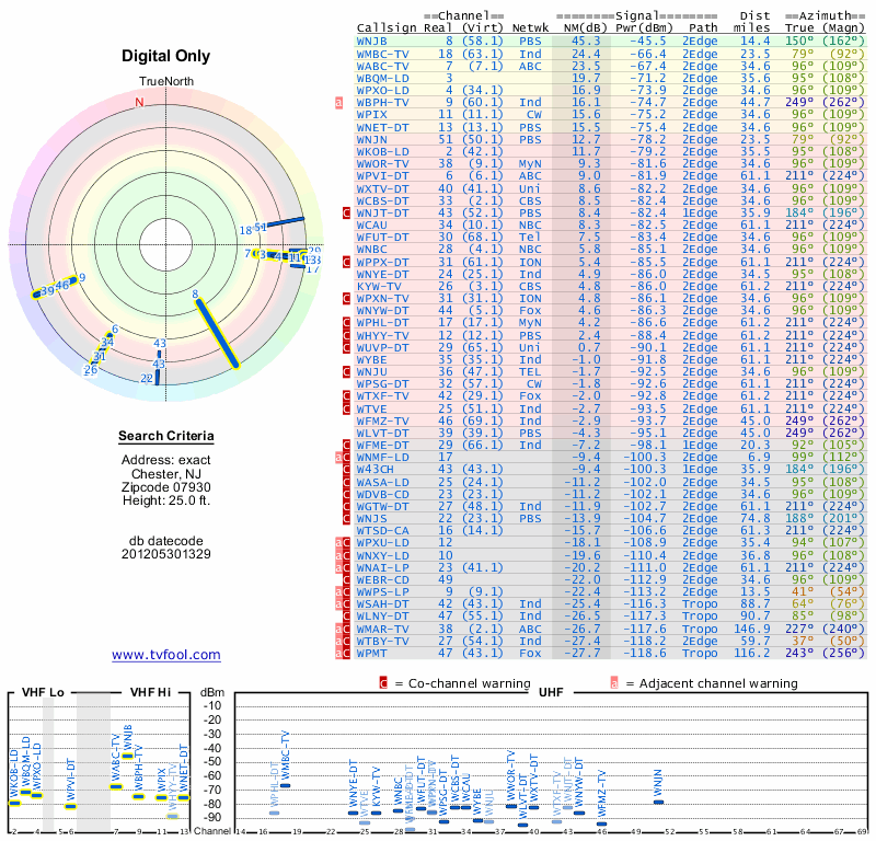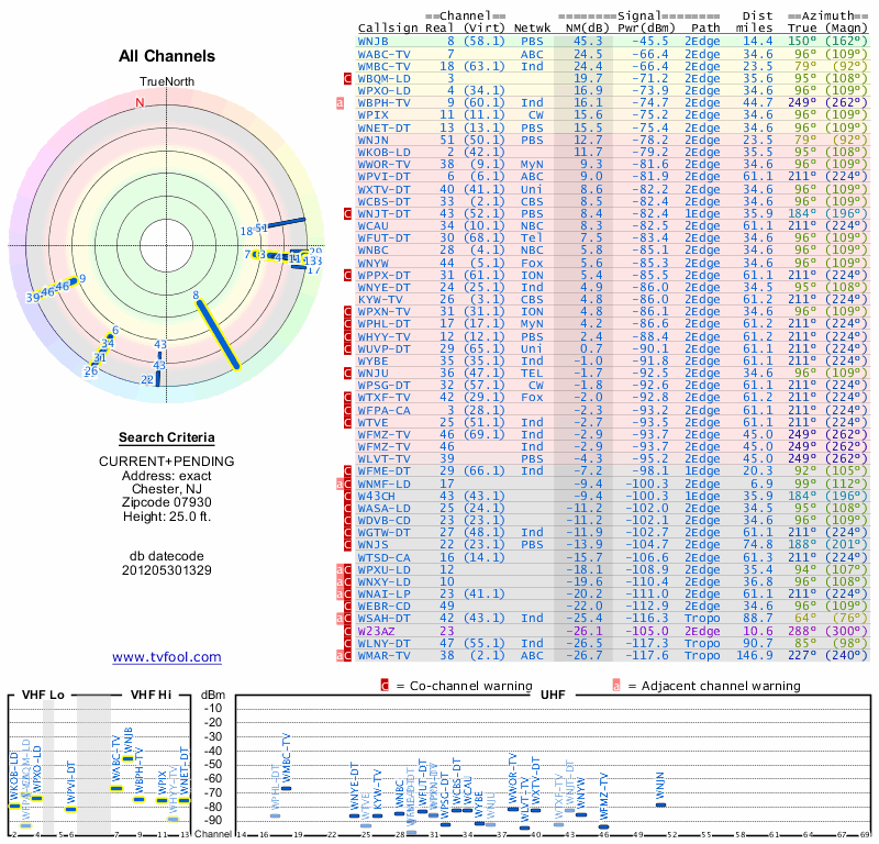 Here are the results for your location. The transmitter database was last updated on June 7, 2013. For more information about these plots and how to interpret them, please check out the Signal Analysis FAQ.