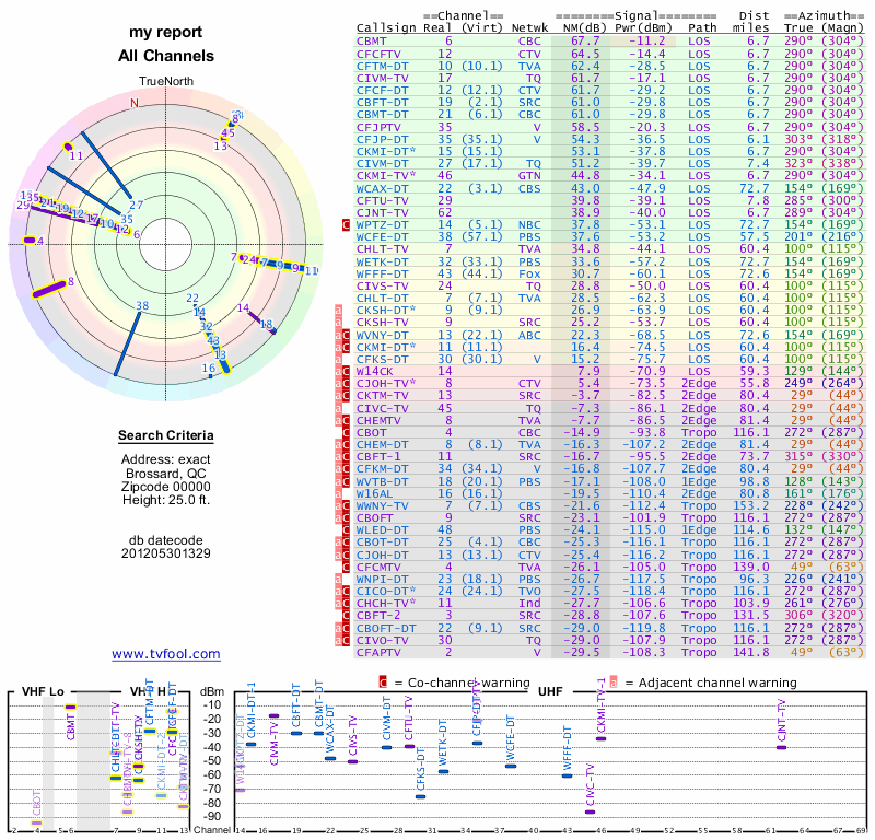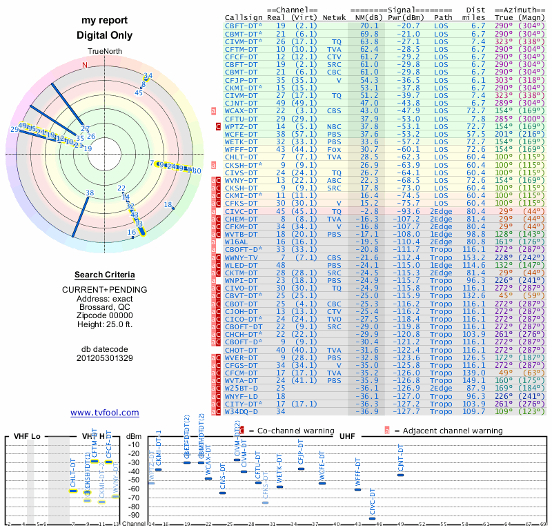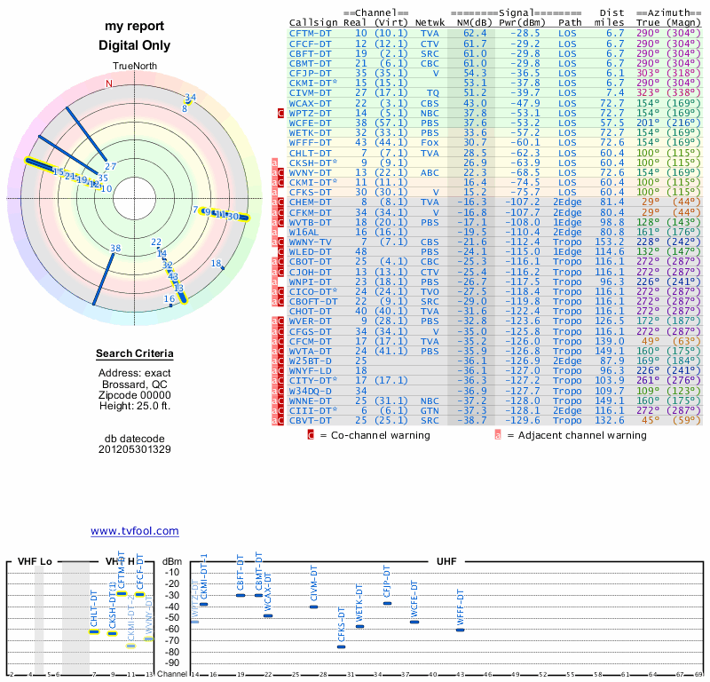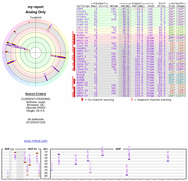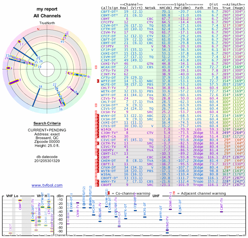 Here are the results for your location. The transmitter database was last updated on June 7, 2013. For more information about these plots and how to interpret them, please check out the Signal Analysis FAQ.