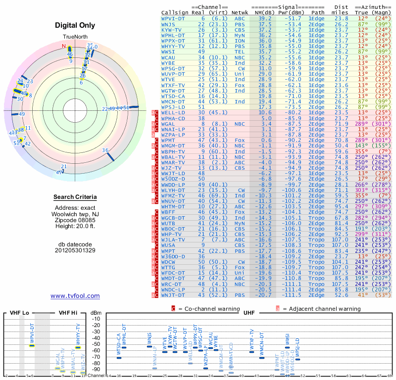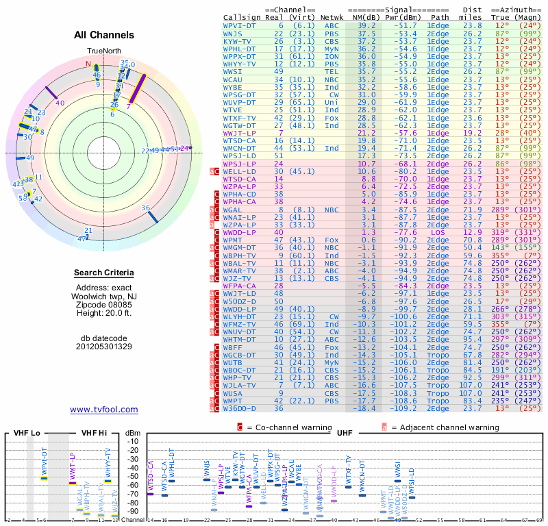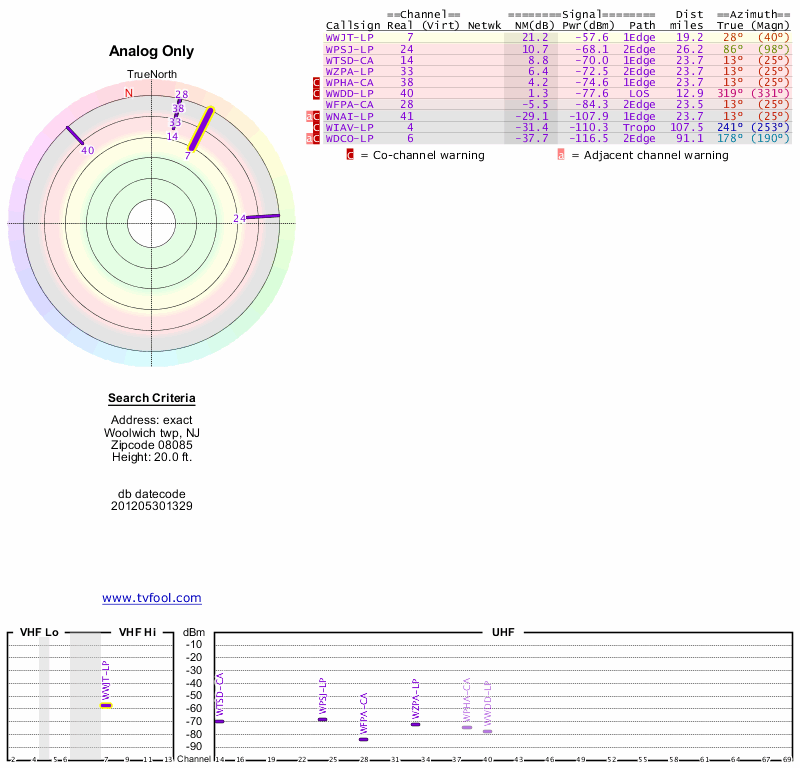 Here are the results for your location. The transmitter database was last updated on June 7, 2013. For more information about these plots and how to interpret them, please check out the Signal Analysis FAQ.