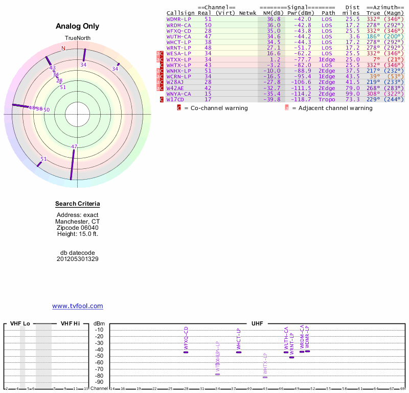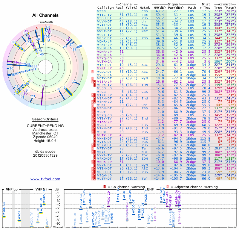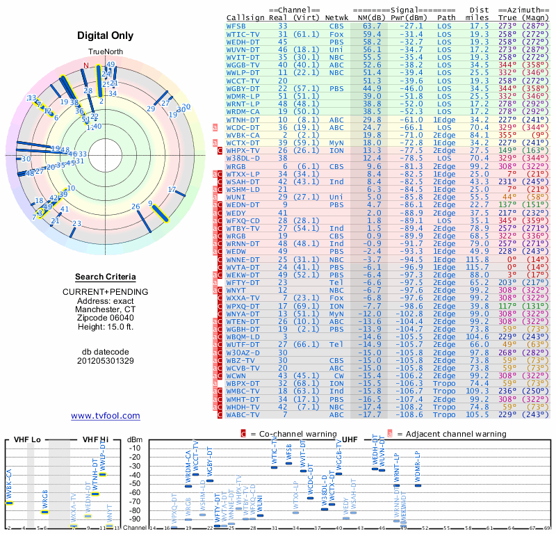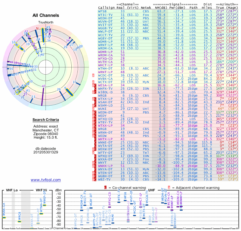 Here are the results for your location. The transmitter database was last updated on June 7, 2013. For more information about these plots and how to interpret them, please check out the Signal Analysis FAQ.