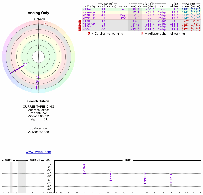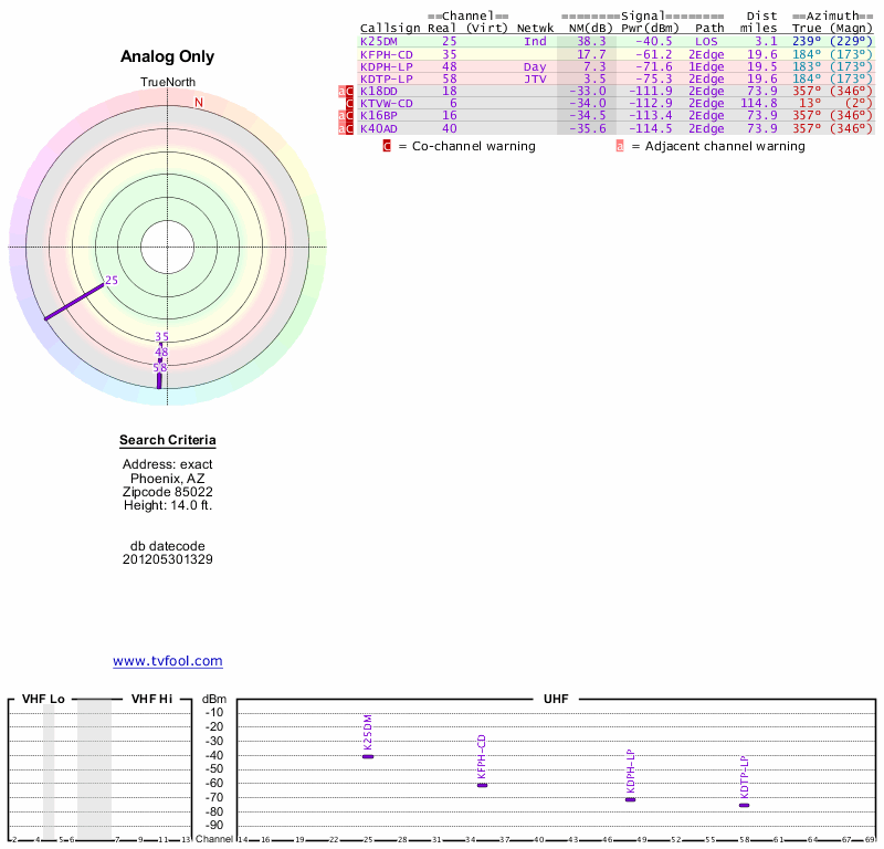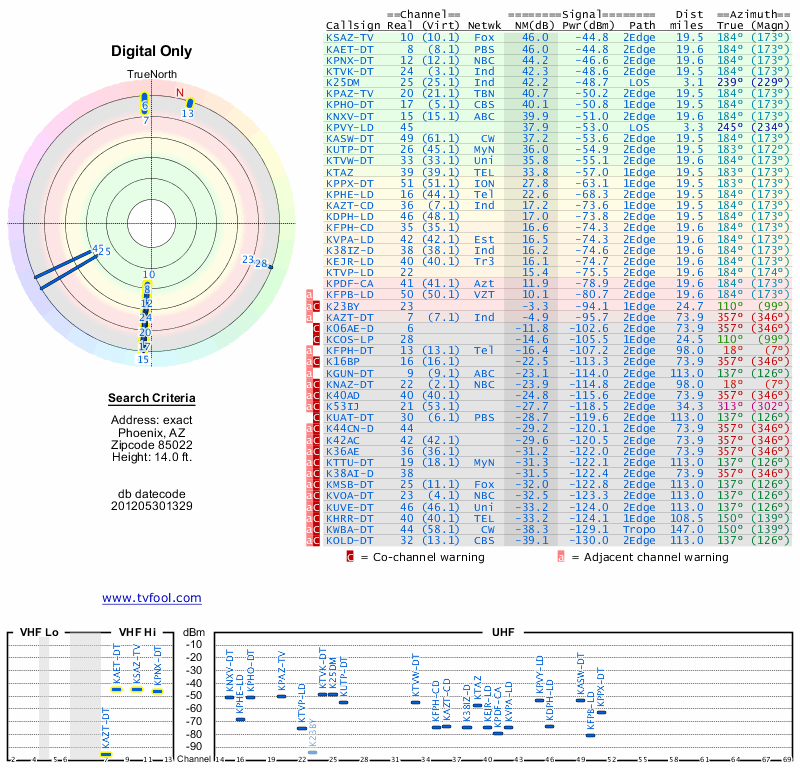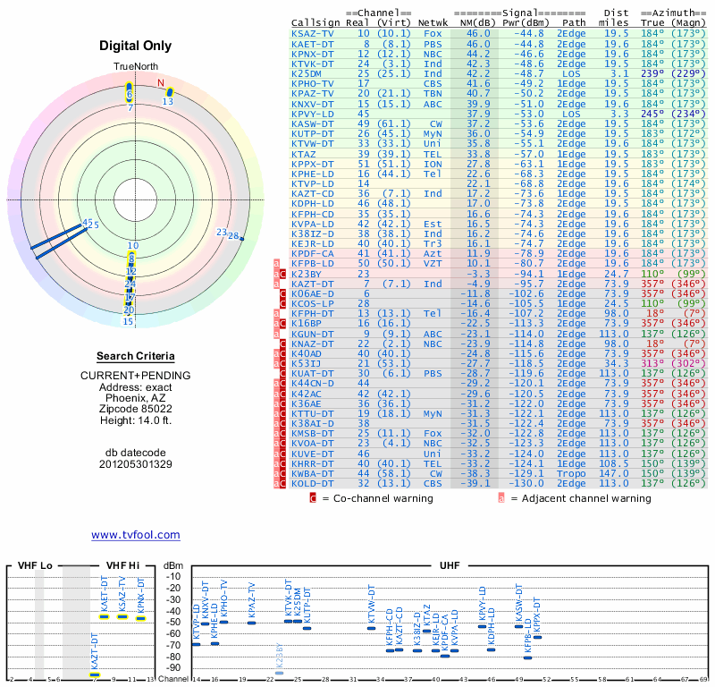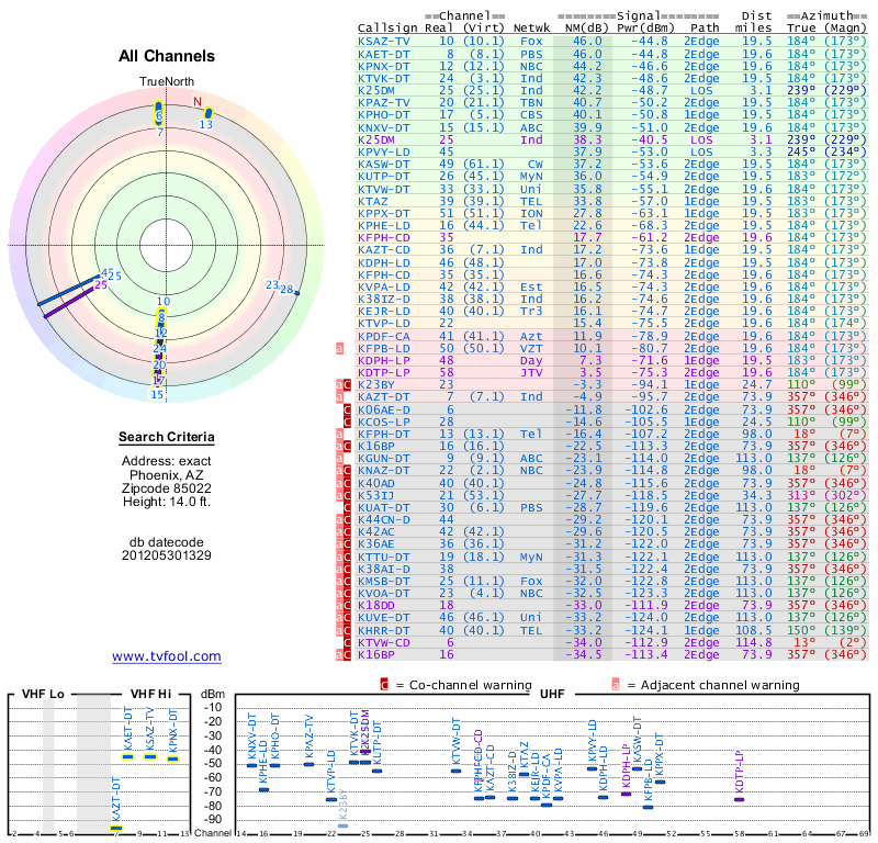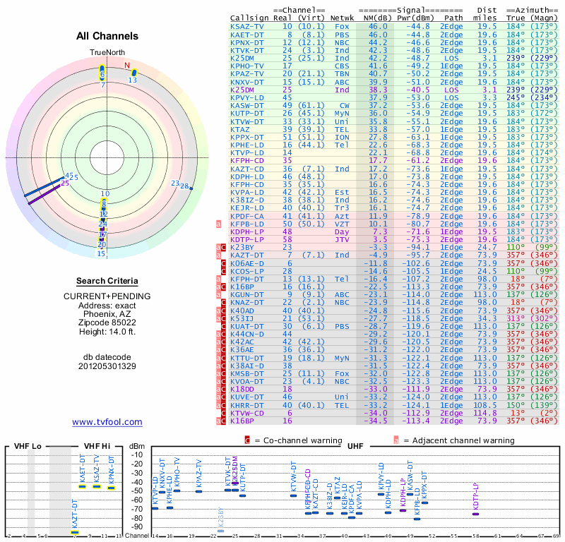 Here are the results for your location. The transmitter database was last updated on June 7, 2013. For more information about these plots and how to interpret them, please check out the Signal Analysis FAQ.