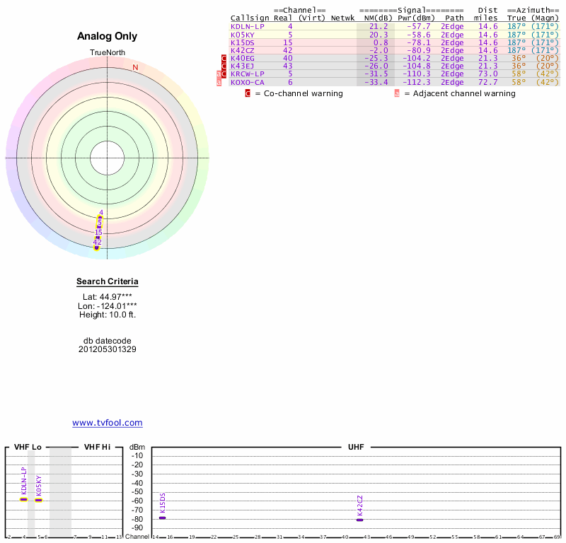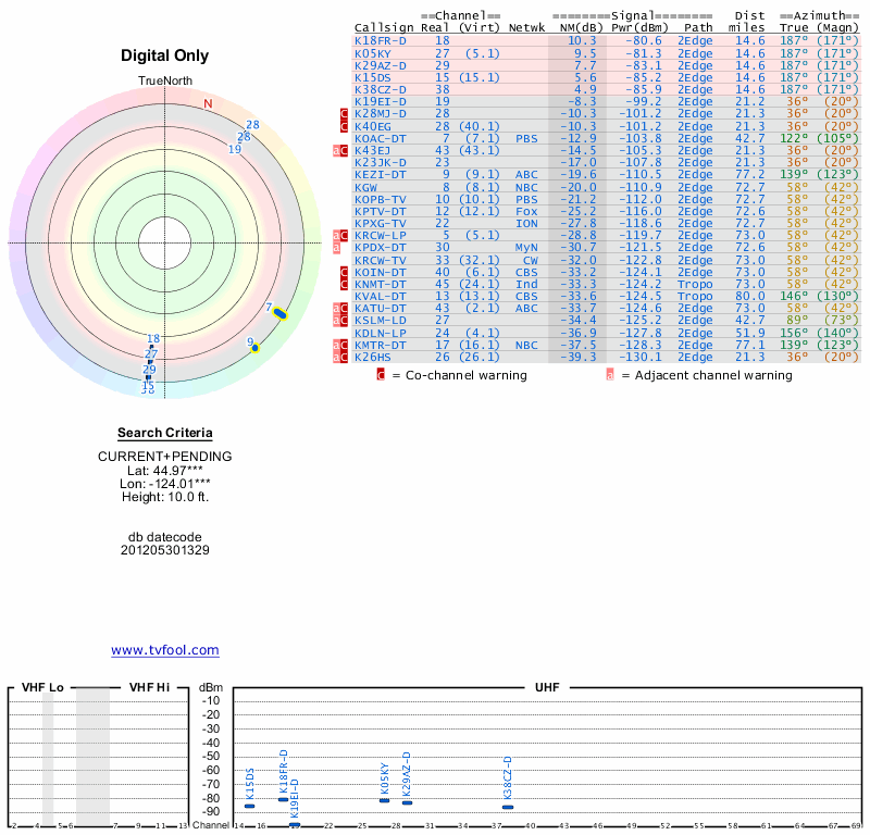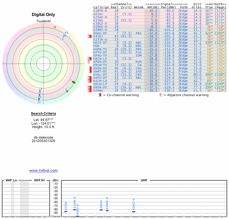 Here are the results for your location. The transmitter database was last updated on June 7, 2013. For more information about these plots and how to interpret them, please check out the Signal Analysis FAQ.