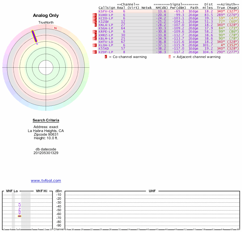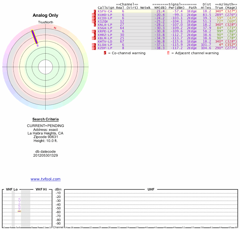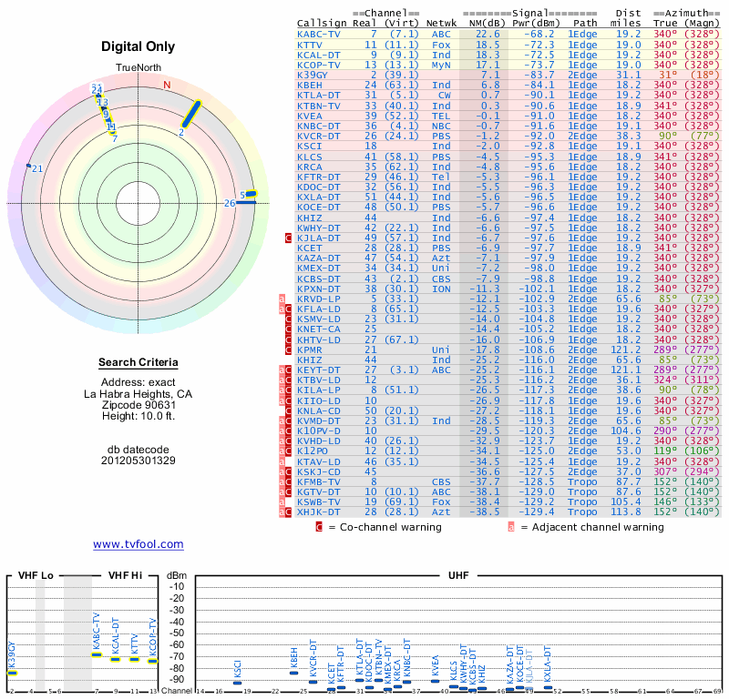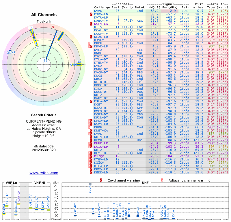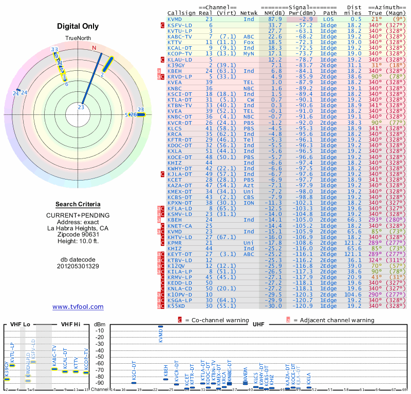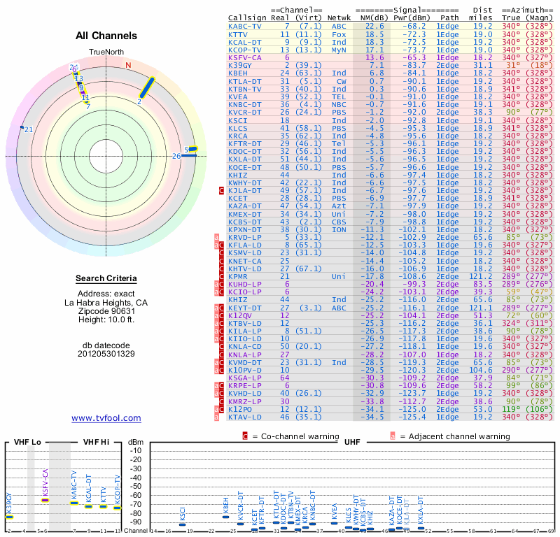 Here are the results for your location. The transmitter database was last updated on June 7, 2013. For more information about these plots and how to interpret them, please check out the Signal Analysis FAQ.