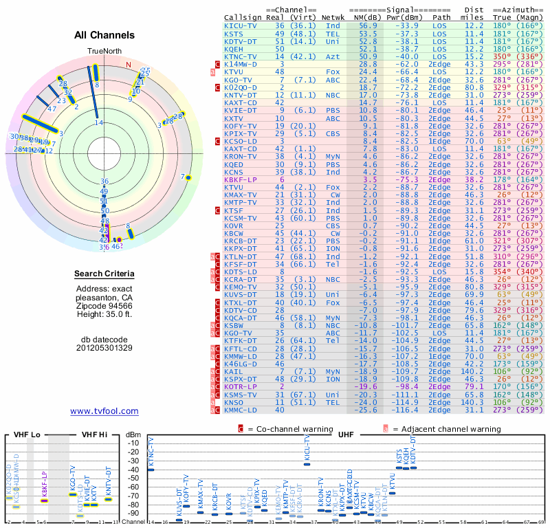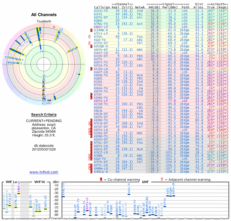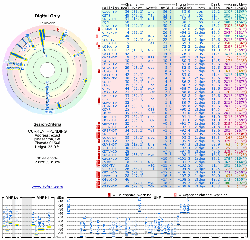 Here are the results for your location. The transmitter database was last updated on June 7, 2013. For more information about these plots and how to interpret them, please check out the Signal Analysis FAQ.