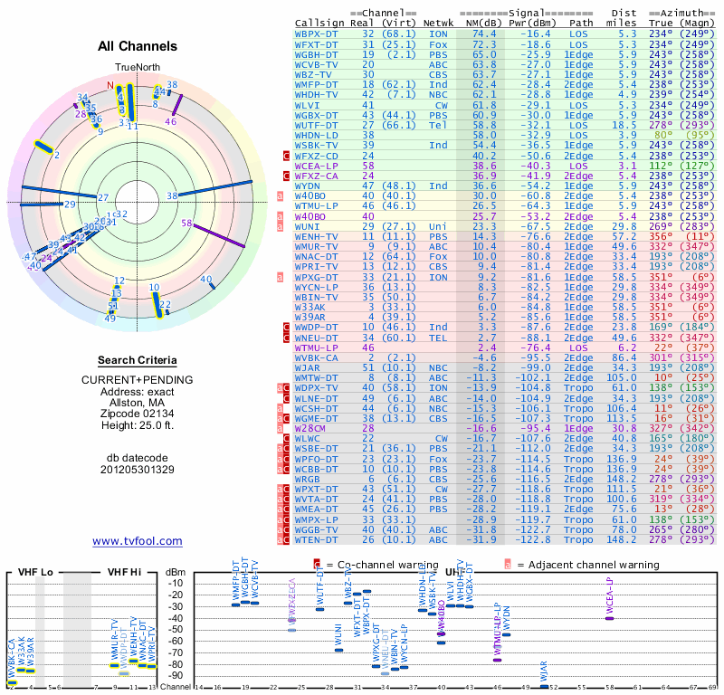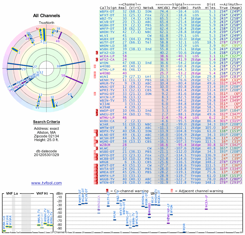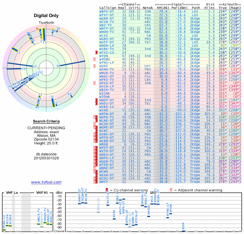 Here are the results for your location. The transmitter database was last updated on June 7, 2013. For more information about these plots and how to interpret them, please check out the Signal Analysis FAQ.