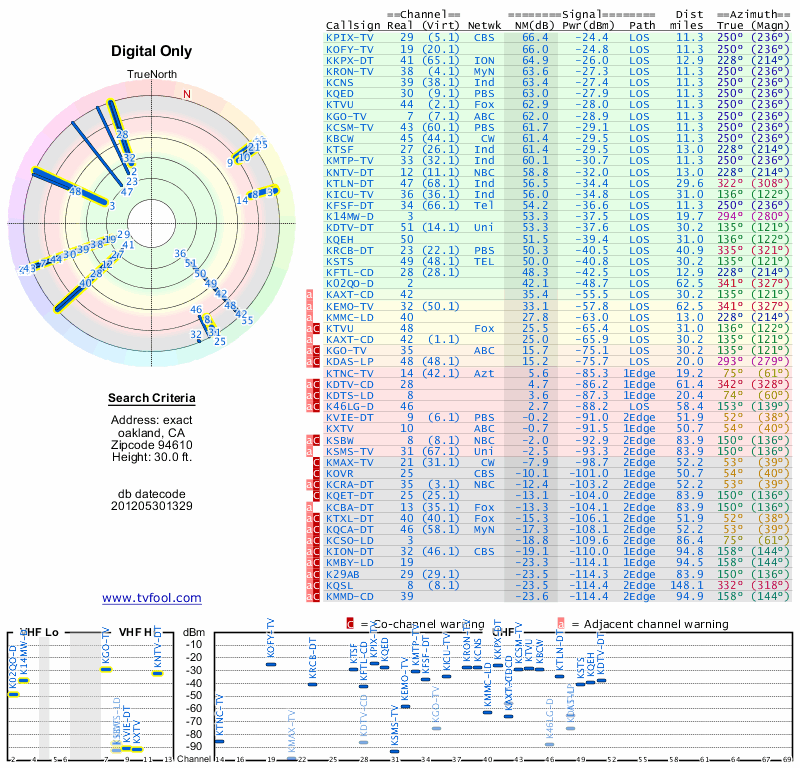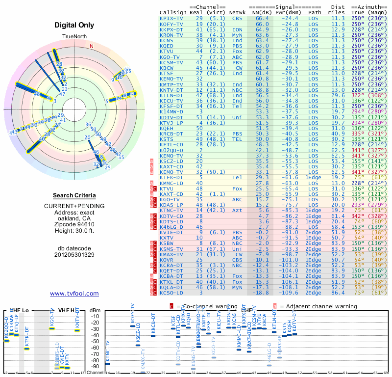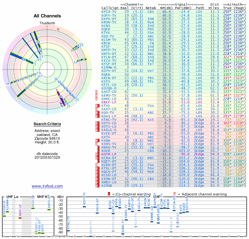 Here are the results for your location. The transmitter database was last updated on June 7, 2013. For more information about these plots and how to interpret them, please check out the Signal Analysis FAQ.