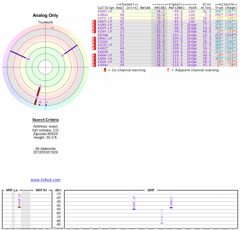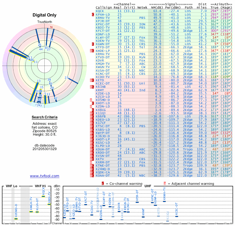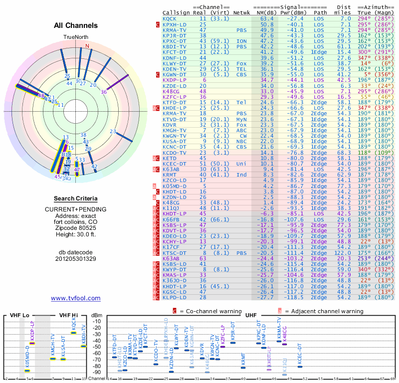 Here are the results for your location. The transmitter database was last updated on June 7, 2013. For more information about these plots and how to interpret them, please check out the Signal Analysis FAQ.