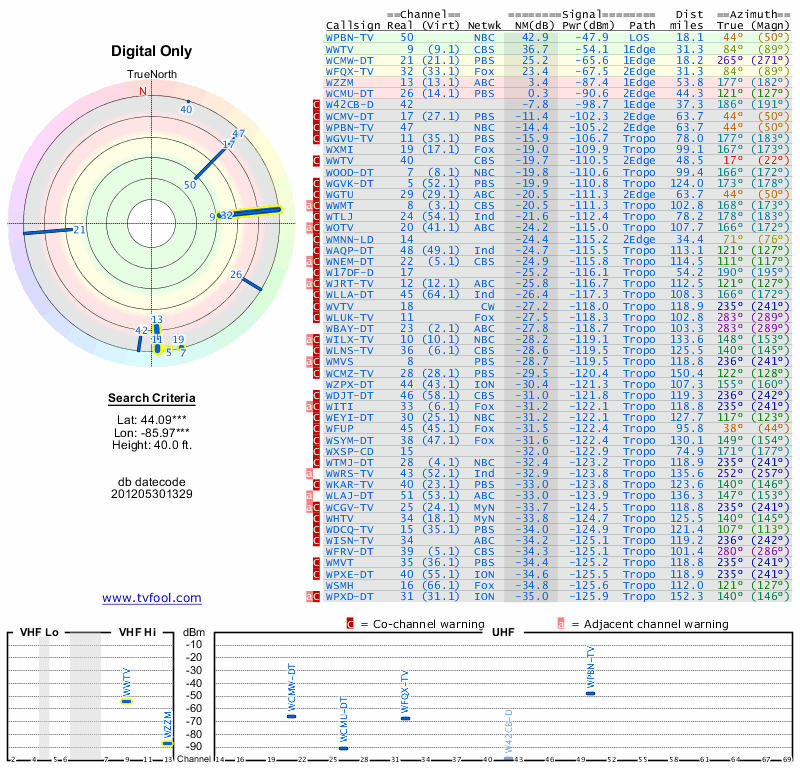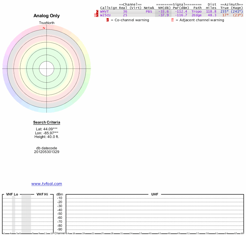 Here are the results for your location. The transmitter database was last updated on June 7, 2013. For more information about these plots and how to interpret them, please check out the Signal Analysis FAQ.