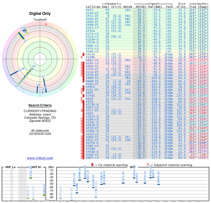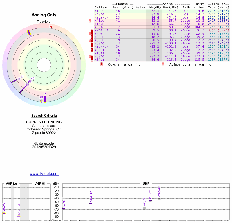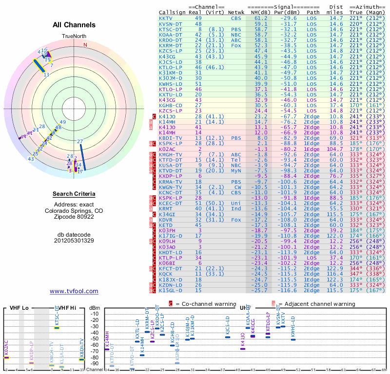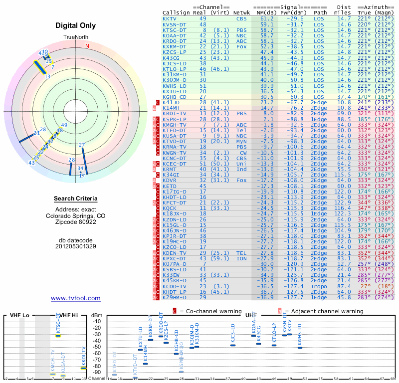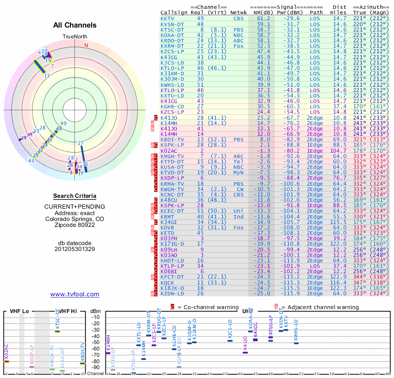 Here are the results for your location. The transmitter database was last updated on June 7, 2013. For more information about these plots and how to interpret them, please check out the Signal Analysis FAQ.