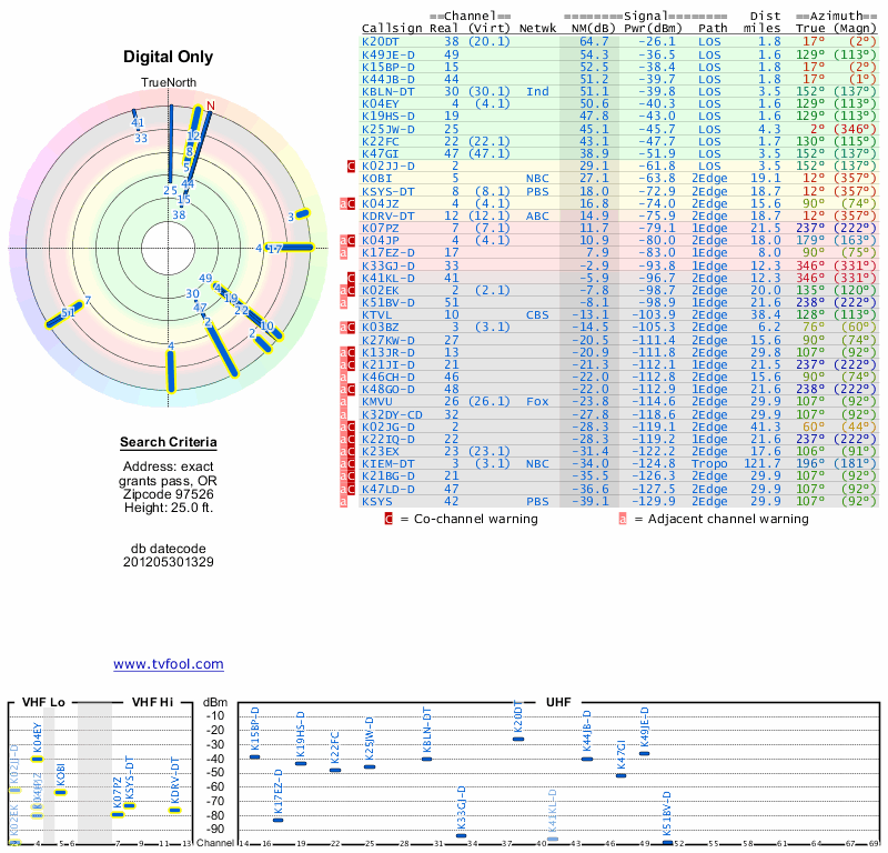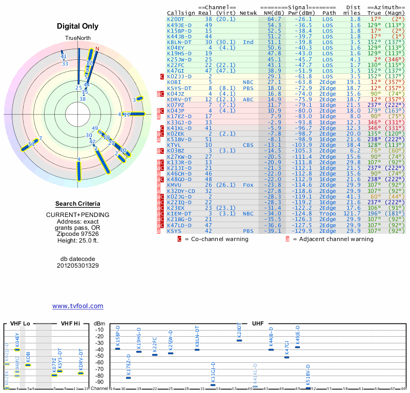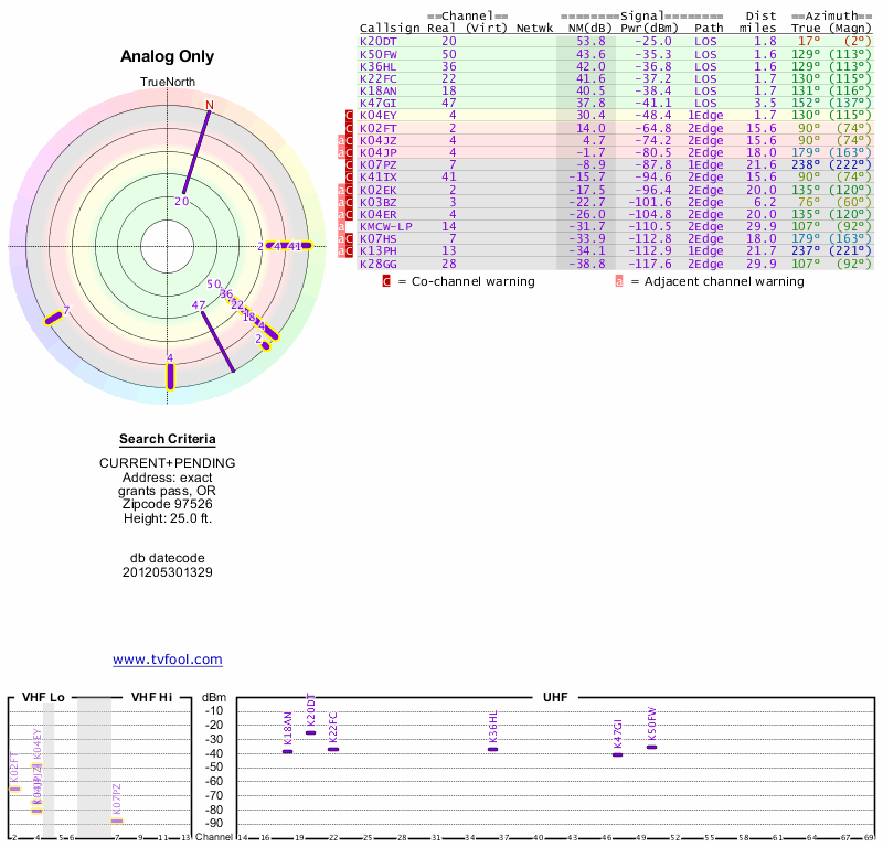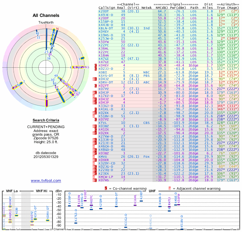 Here are the results for your location. The transmitter database was last updated on June 7, 2013. For more information about these plots and how to interpret them, please check out the Signal Analysis FAQ.