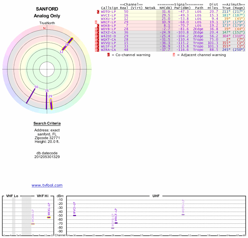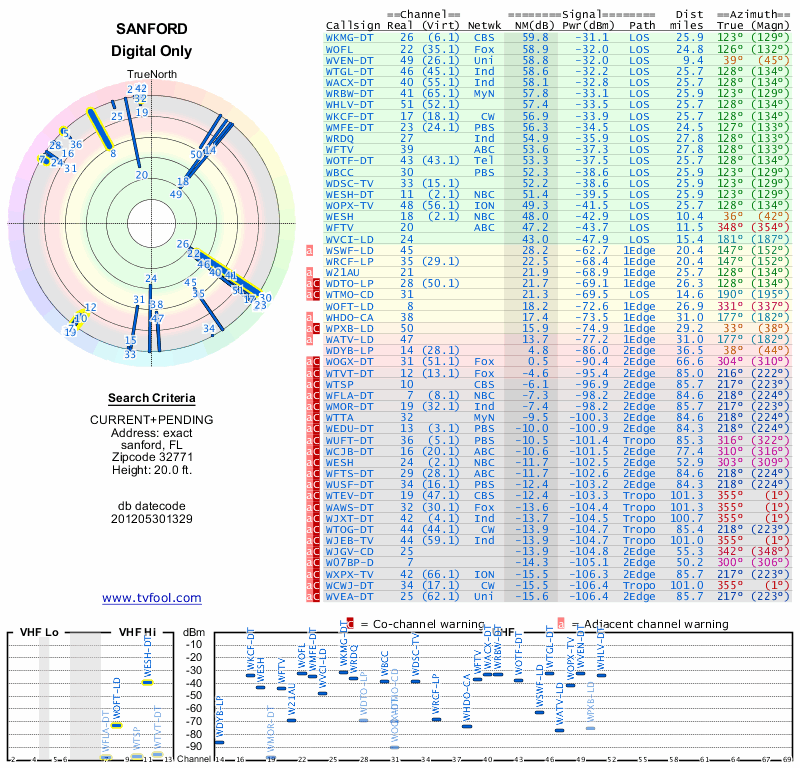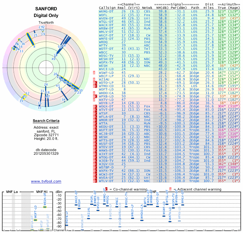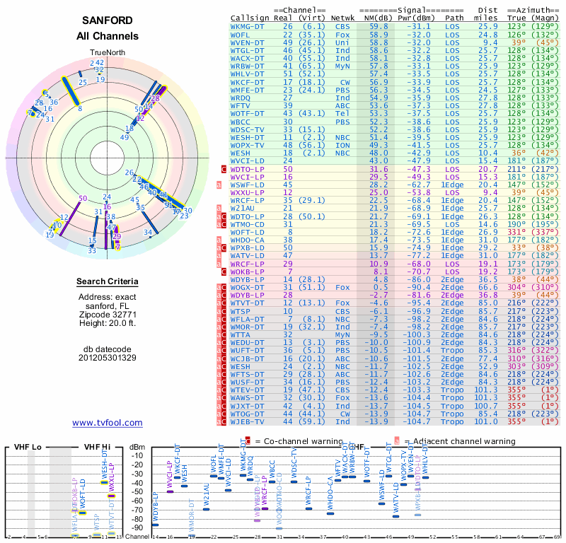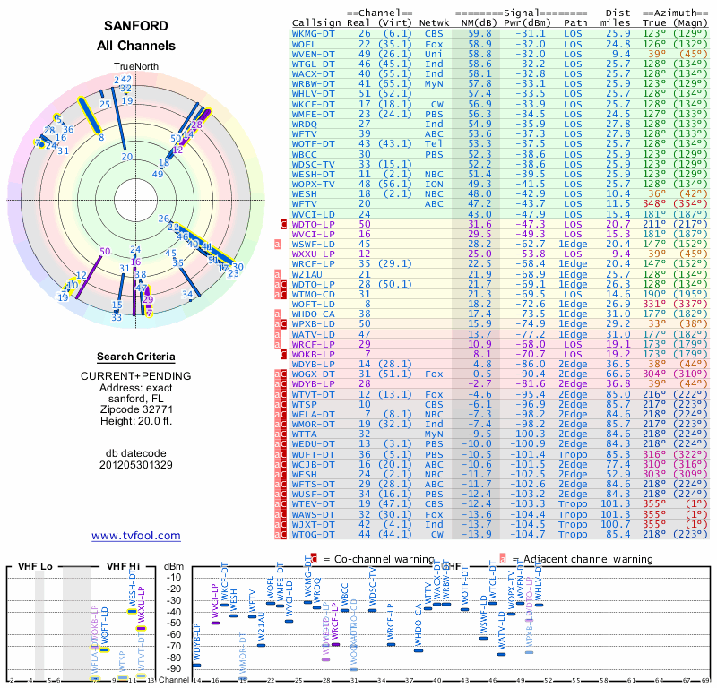 Here are the results for your location. The transmitter database was last updated on June 7, 2013. For more information about these plots and how to interpret them, please check out the Signal Analysis FAQ.