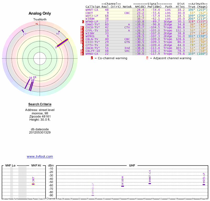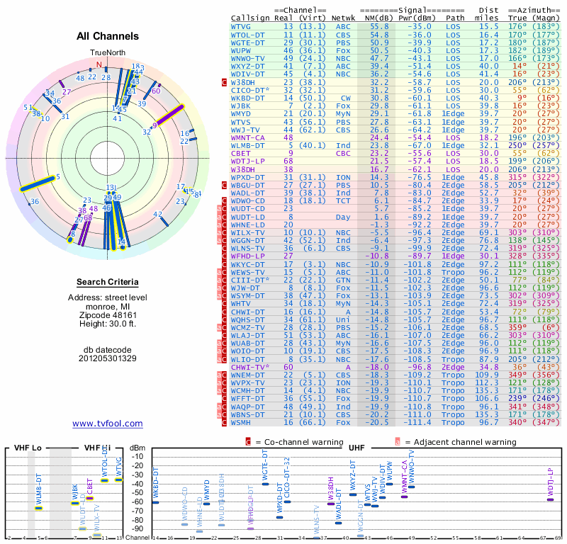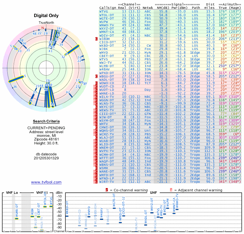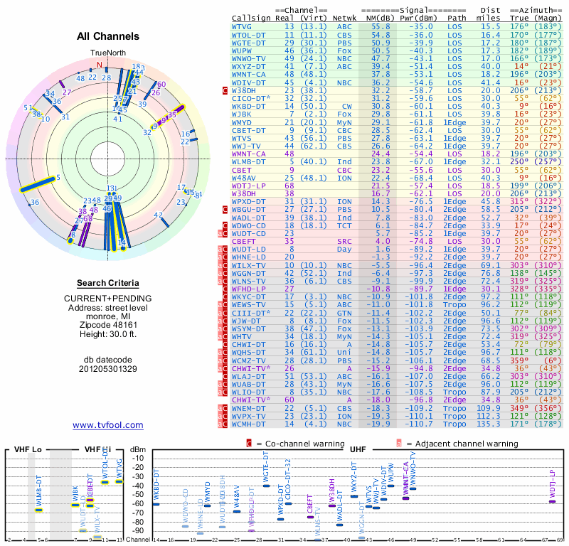 Here are the results for your location. The transmitter database was last updated on June 7, 2013. For more information about these plots and how to interpret them, please check out the Signal Analysis FAQ.