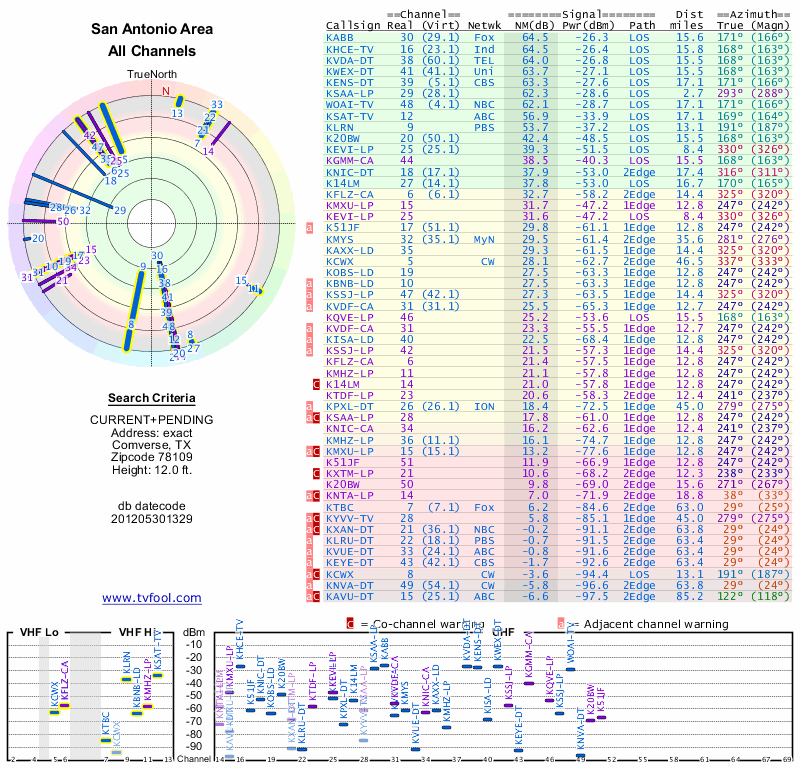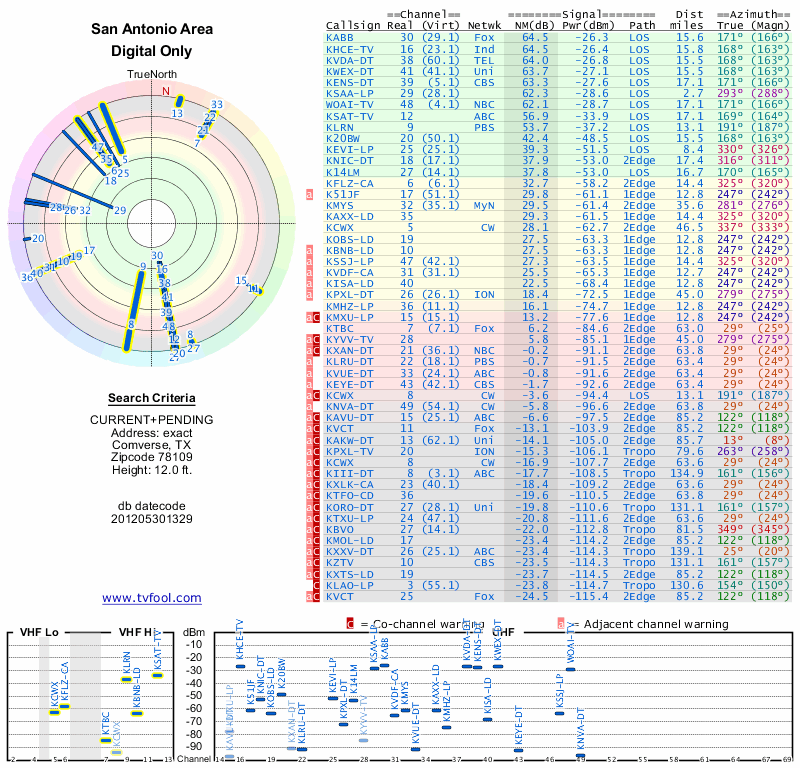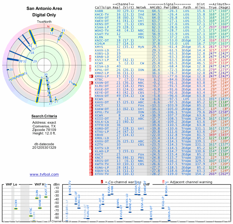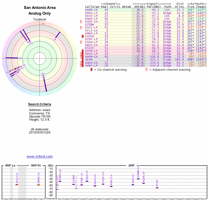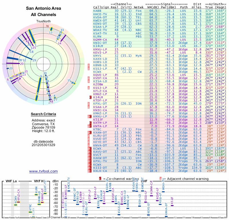 Here are the results for your location. The transmitter database was last updated on June 7, 2013. For more information about these plots and how to interpret them, please check out the Signal Analysis FAQ.