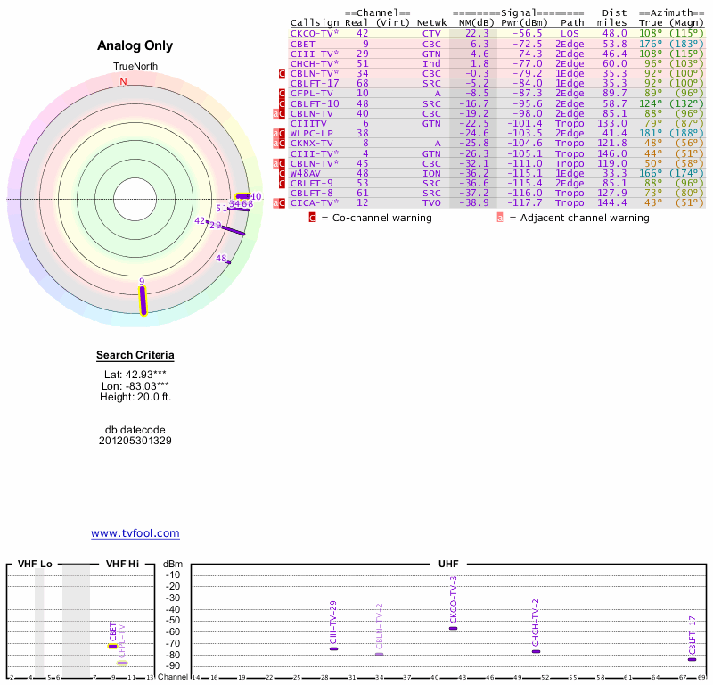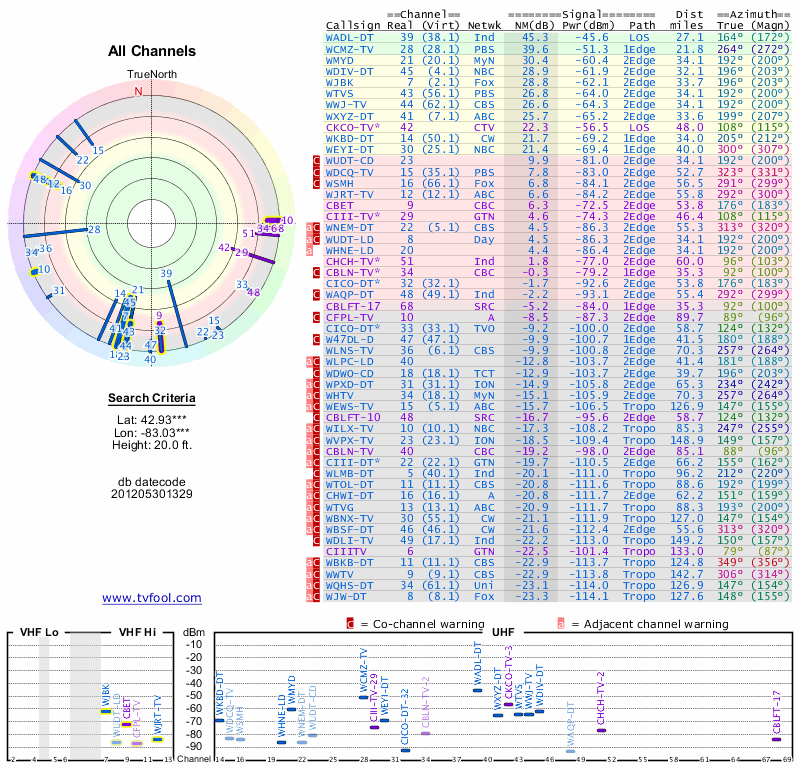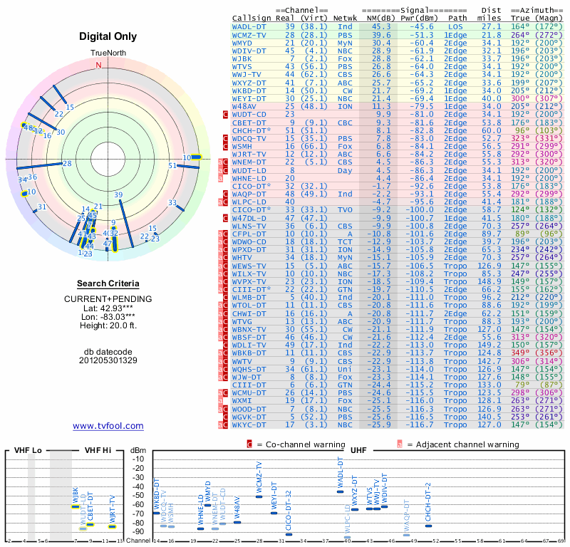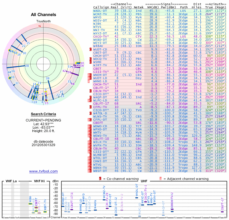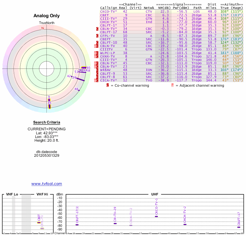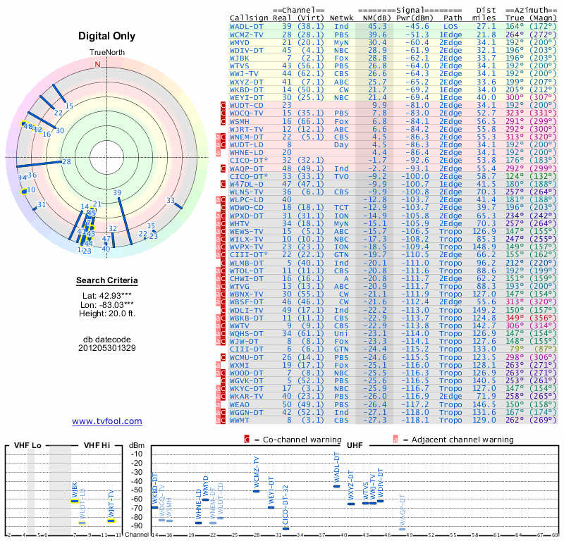 Here are the results for your location. The transmitter database was last updated on June 7, 2013. For more information about these plots and how to interpret them, please check out the Signal Analysis FAQ.