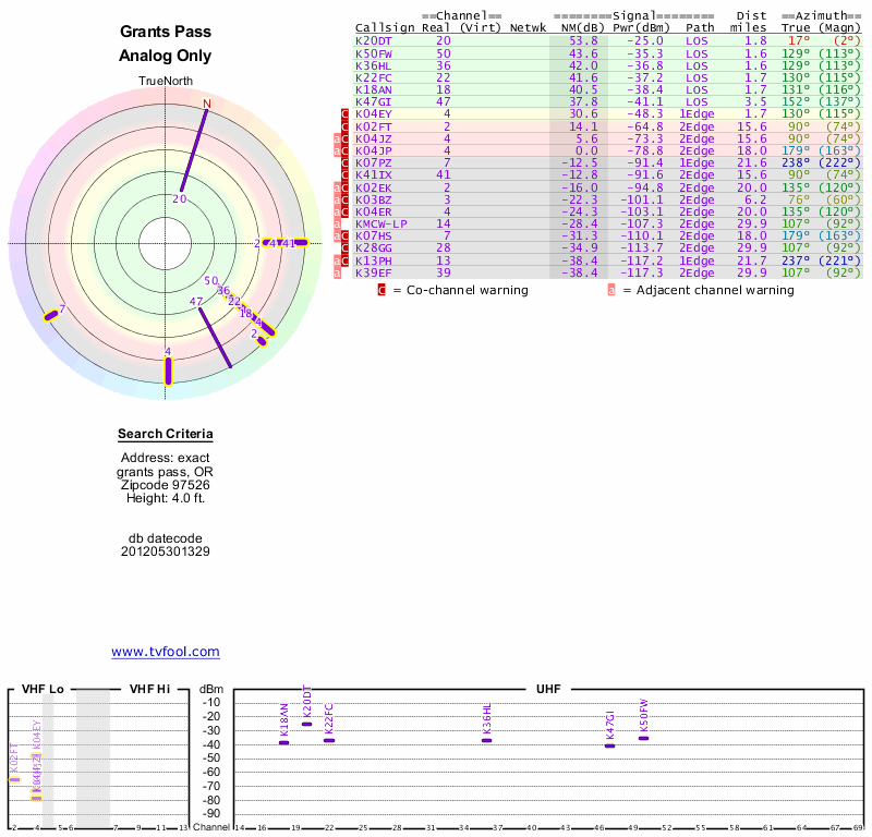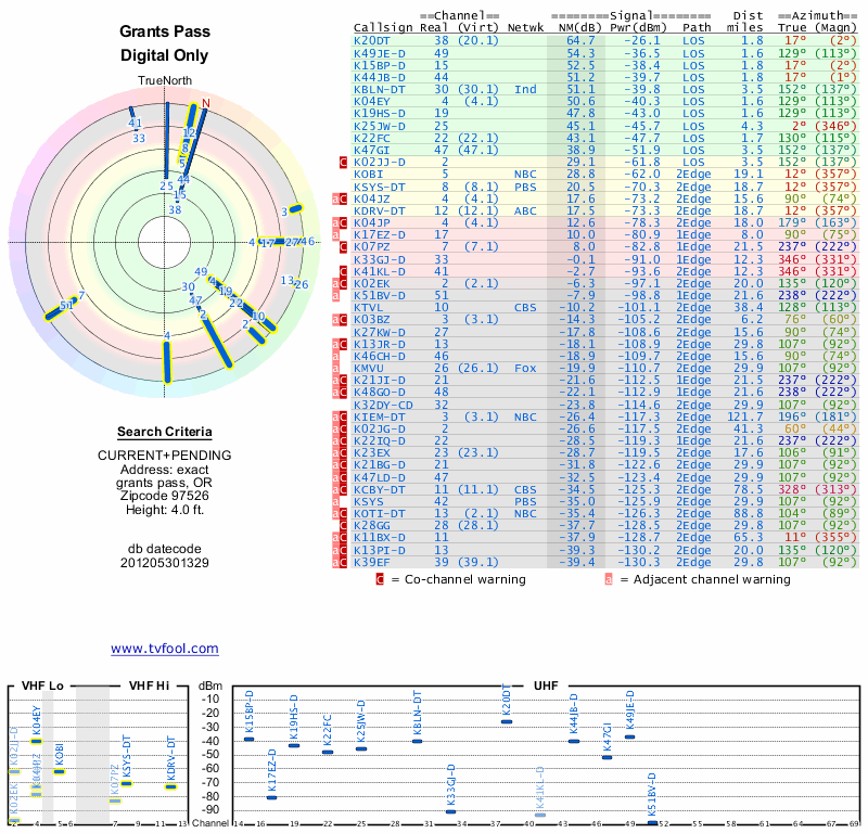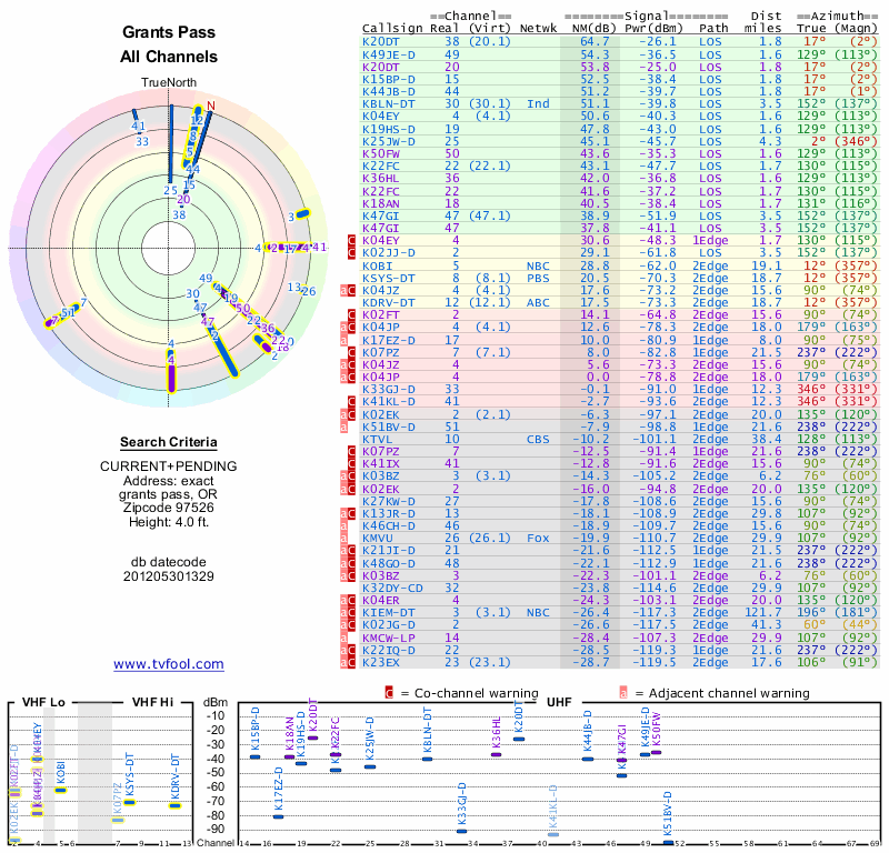 Here are the results for your location. The transmitter database was last updated on June 7, 2013. For more information about these plots and how to interpret them, please check out the Signal Analysis FAQ.