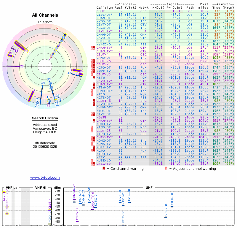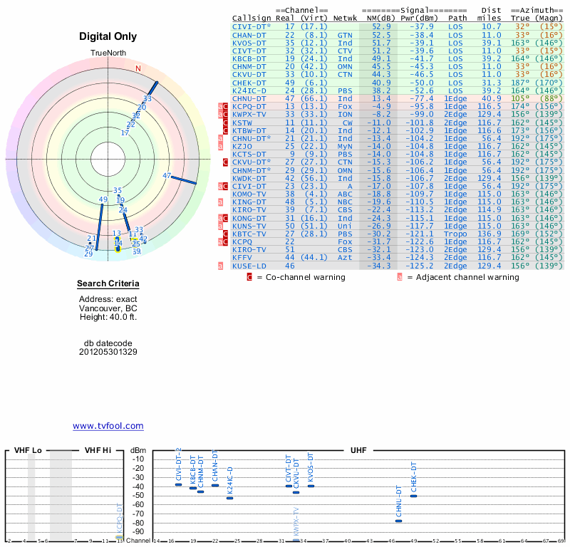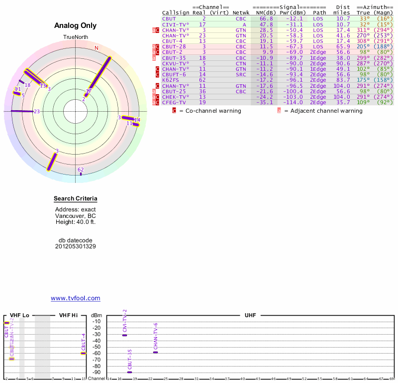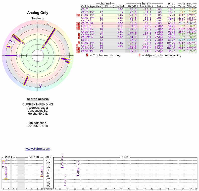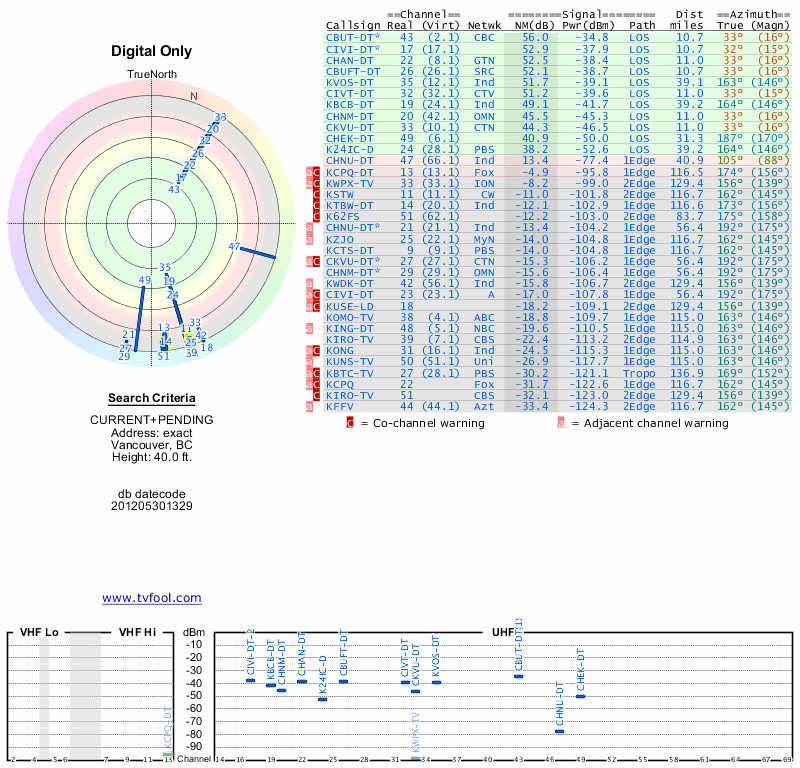 Here are the results for your location. The transmitter database was last updated on June 7, 2013. For more information about these plots and how to interpret them, please check out the Signal Analysis FAQ.