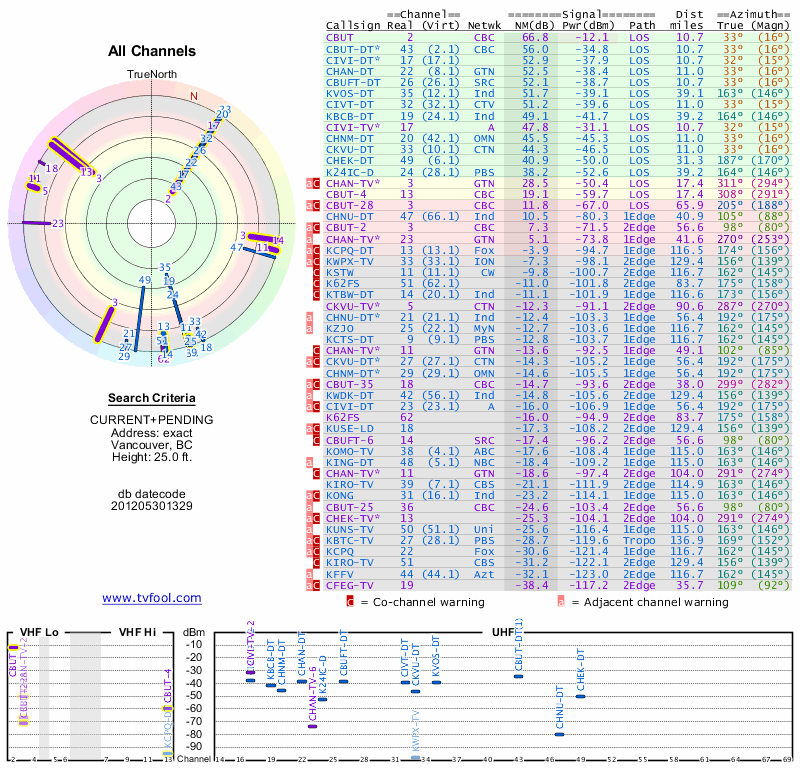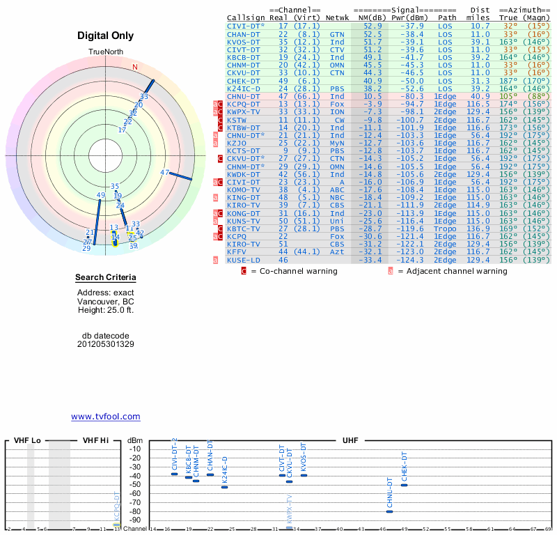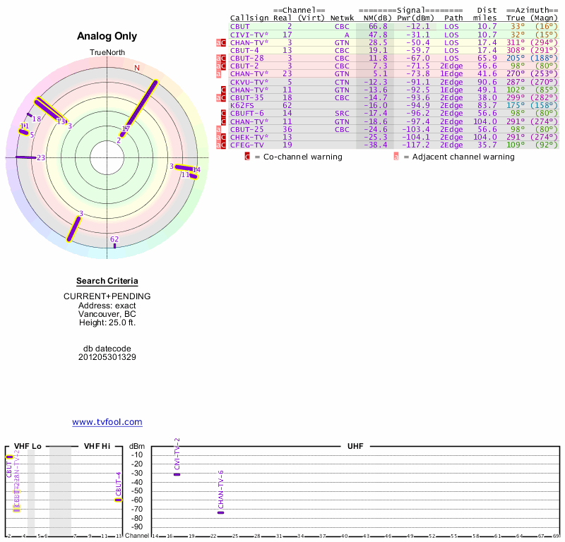 Here are the results for your location. The transmitter database was last updated on June 7, 2013. For more information about these plots and how to interpret them, please check out the Signal Analysis FAQ.