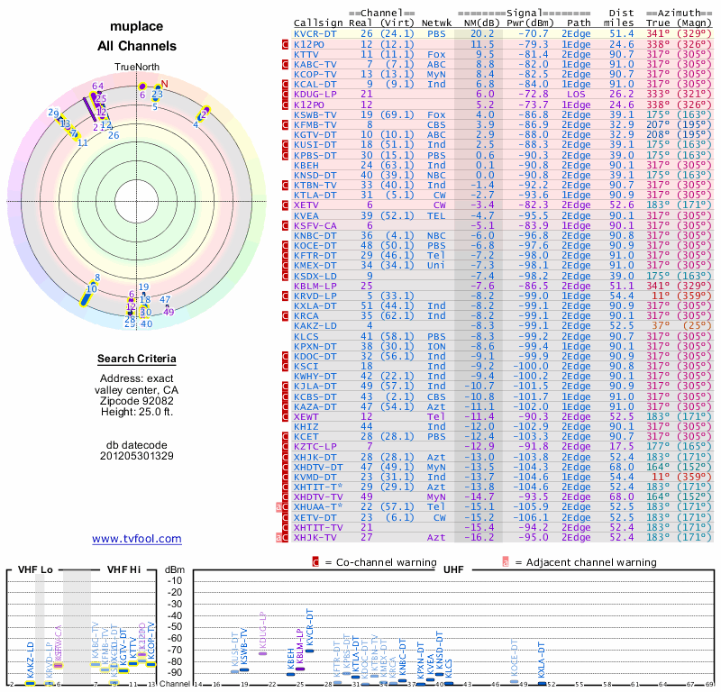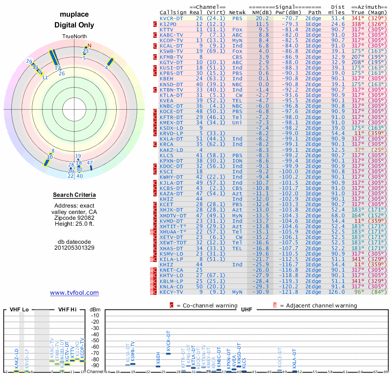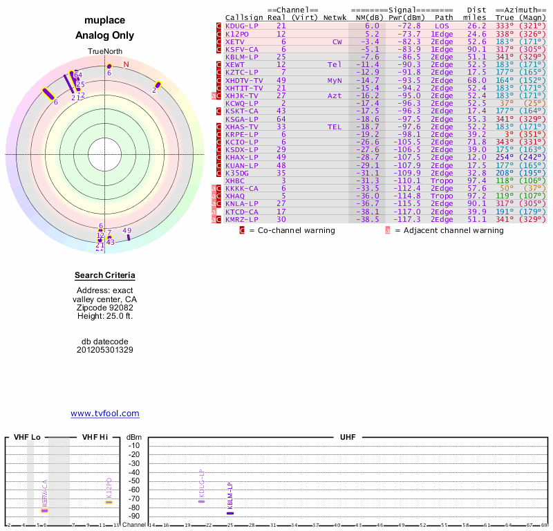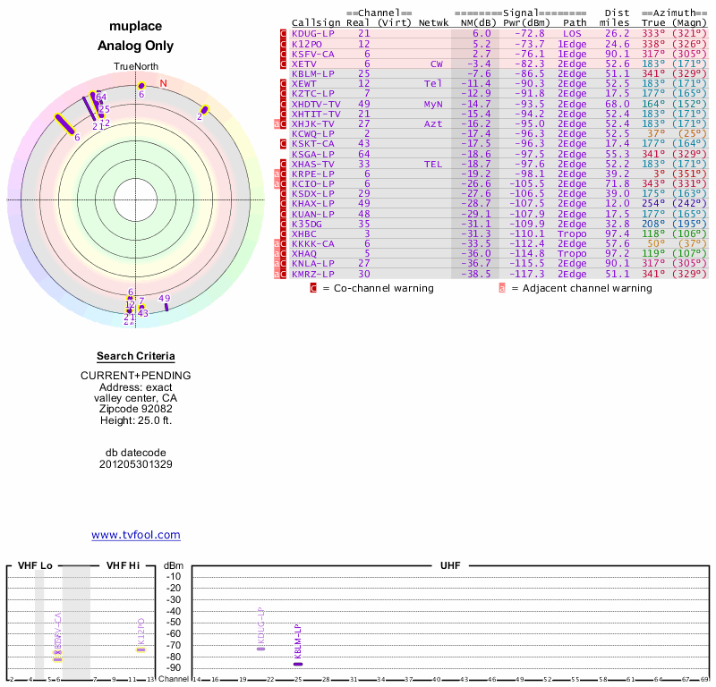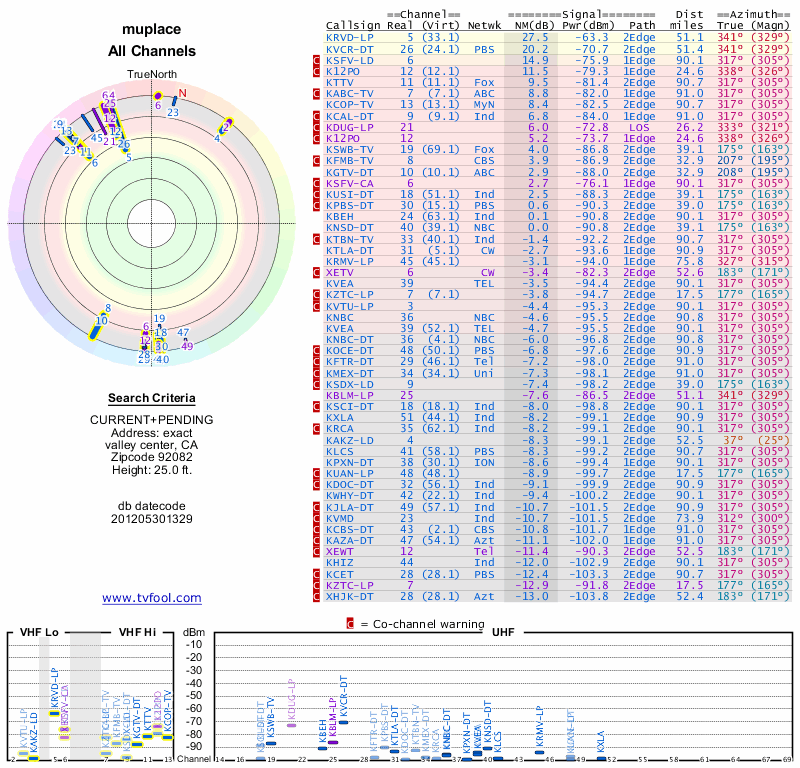 Here are the results for your location. The transmitter database was last updated on June 7, 2013. For more information about these plots and how to interpret them, please check out the Signal Analysis FAQ.