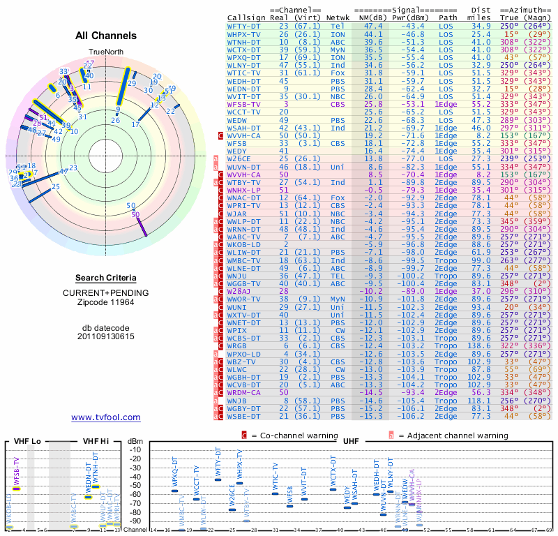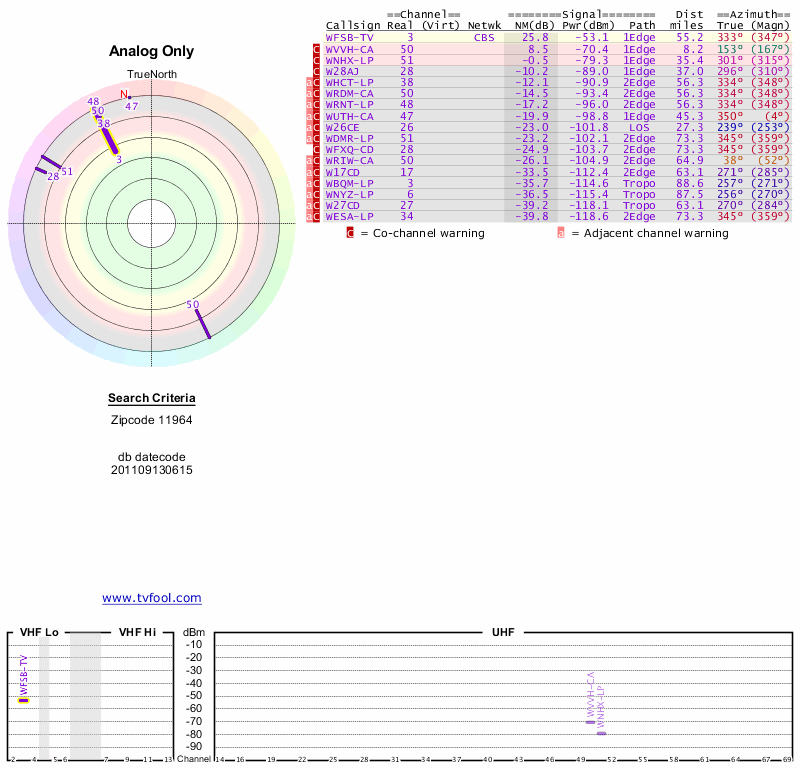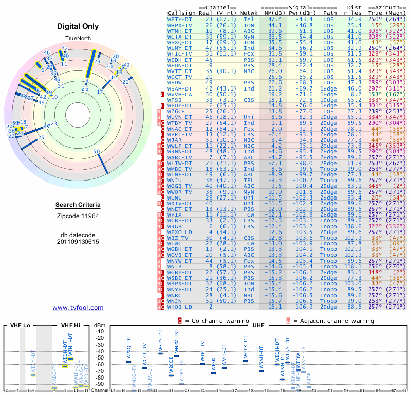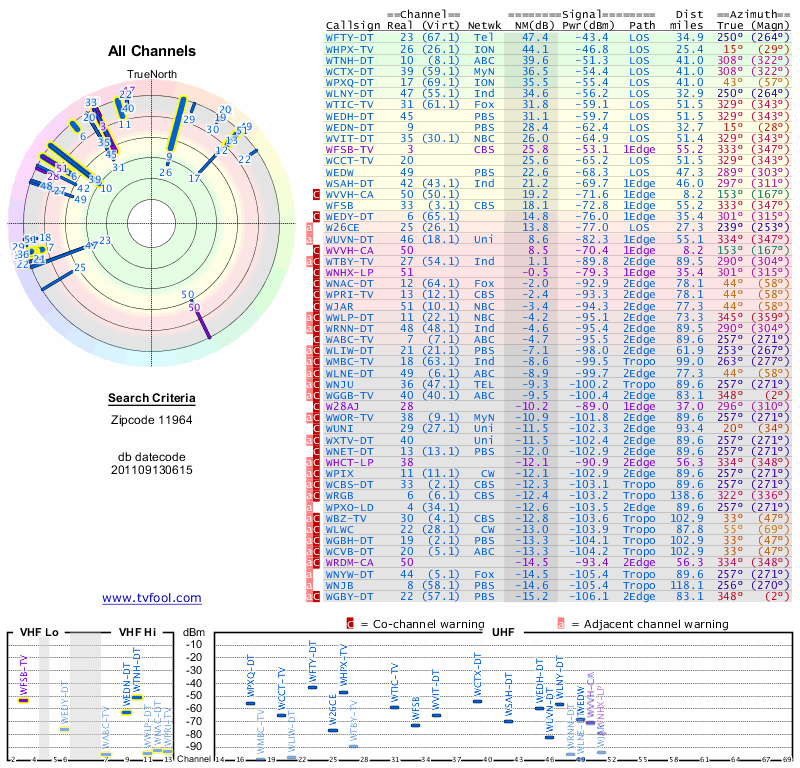 Here are the results for your location. The transmitter database was last updated on June 7, 2013. For more information about these plots and how to interpret them, please check out the Signal Analysis FAQ.