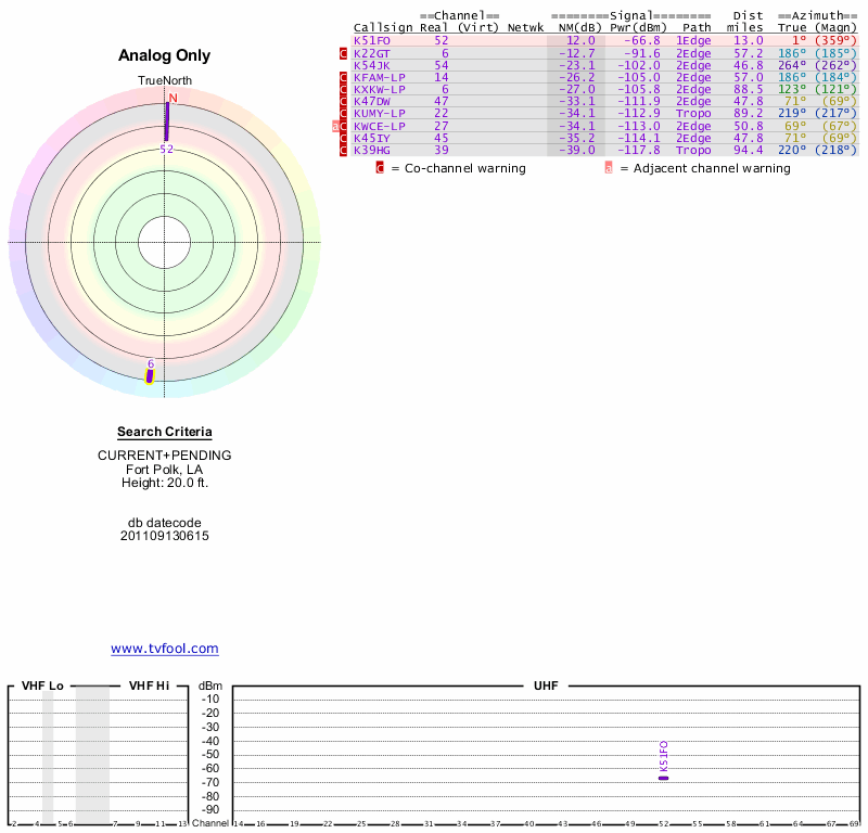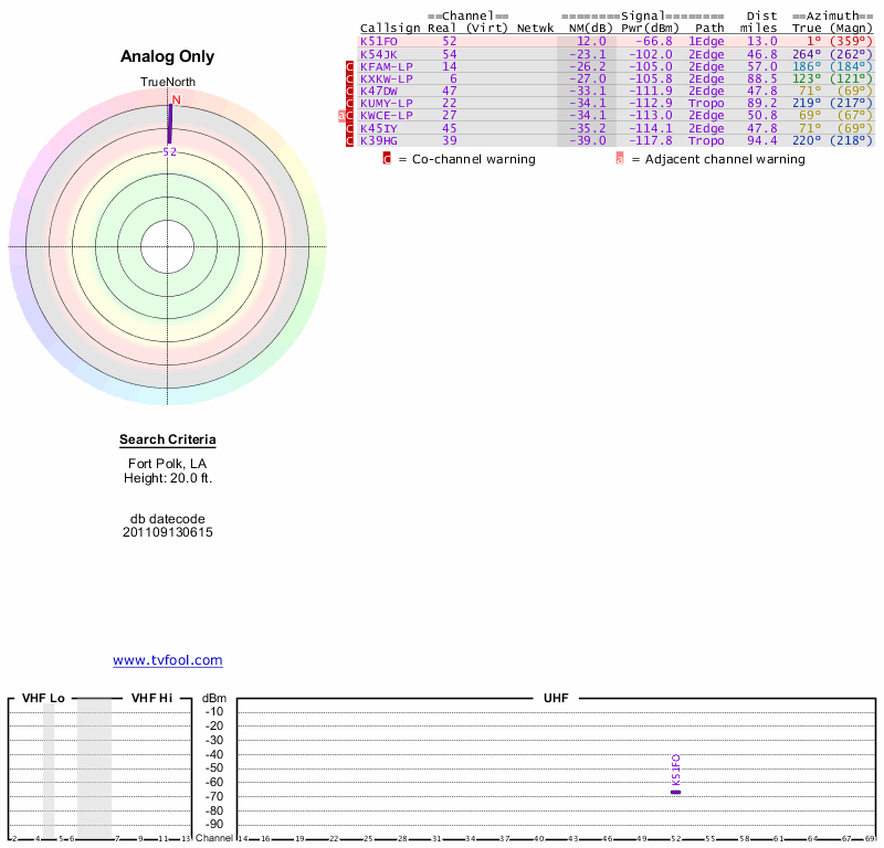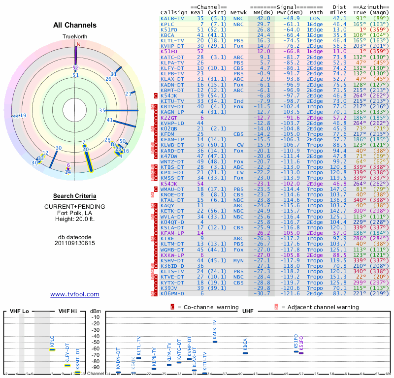 Here are the results for your location. The transmitter database was last updated on June 7, 2013. For more information about these plots and how to interpret them, please check out the Signal Analysis FAQ.
