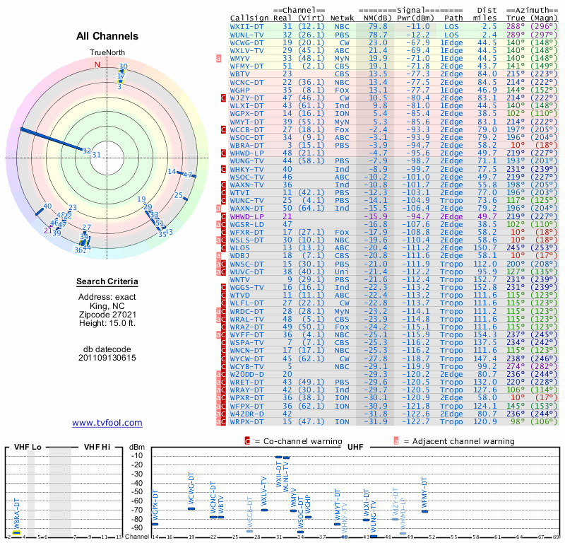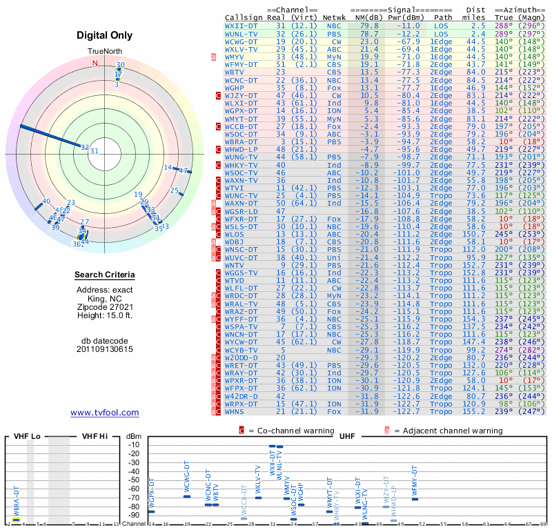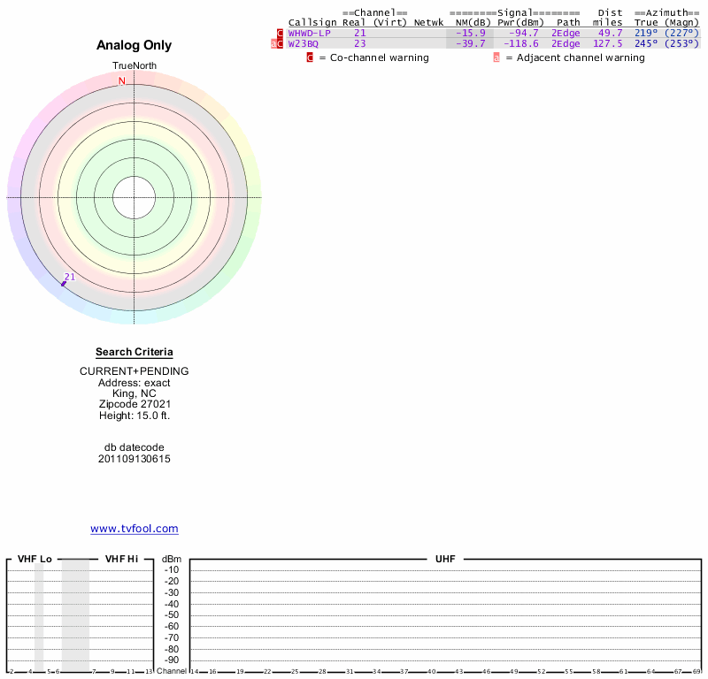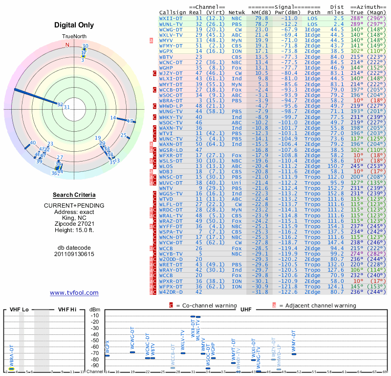 Here are the results for your location. The transmitter database was last updated on June 7, 2013. For more information about these plots and how to interpret them, please check out the Signal Analysis FAQ.