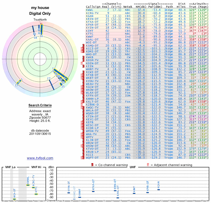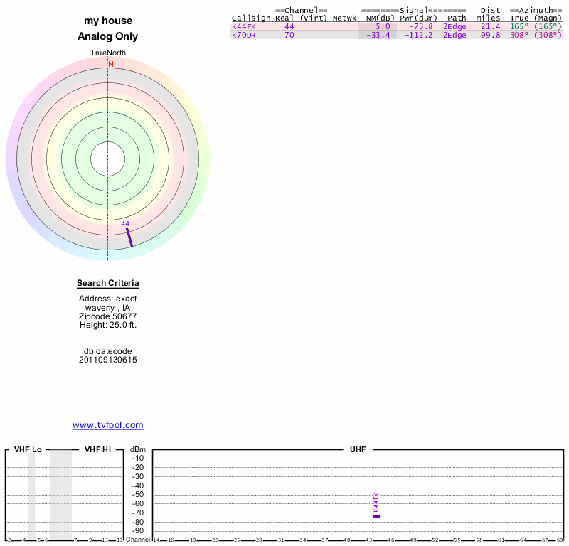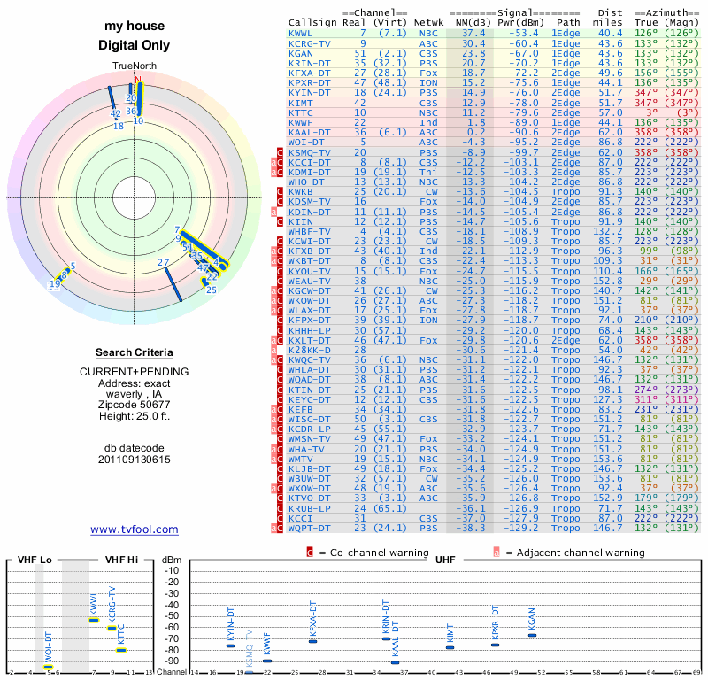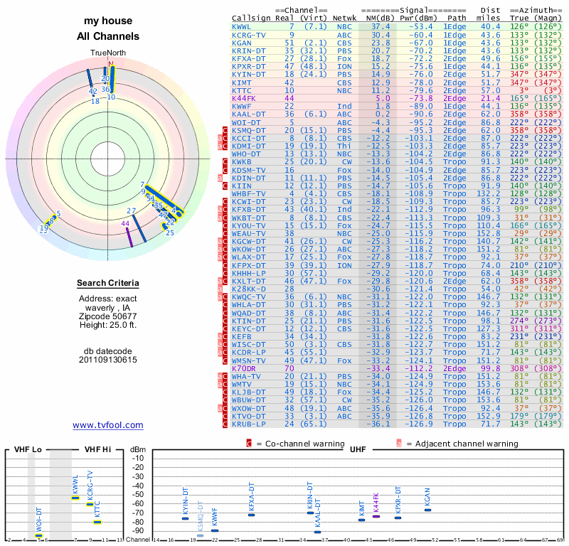Here are the results for your location. The transmitter database was last updated on June 7, 2013. For more information about these plots and how to interpret them, please check out the Signal Analysis FAQ.