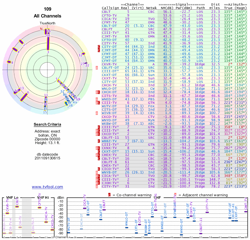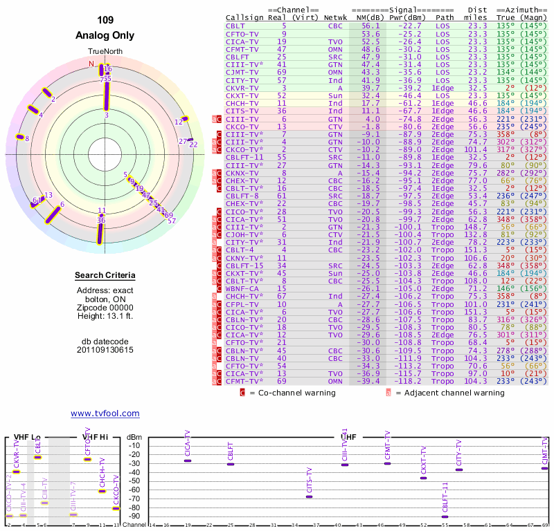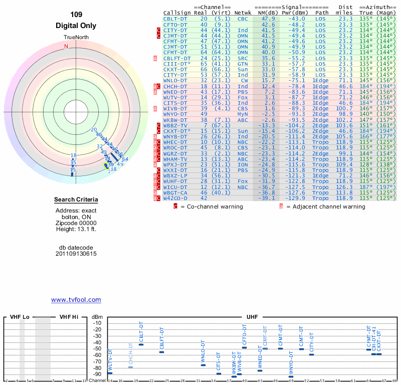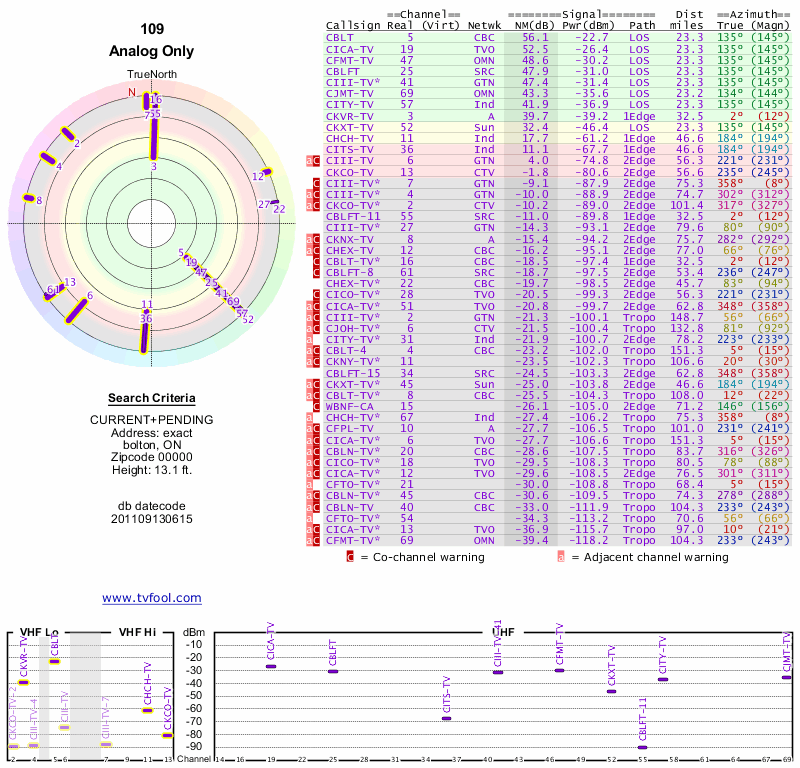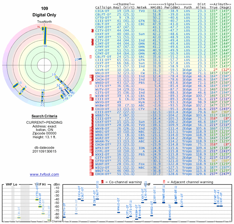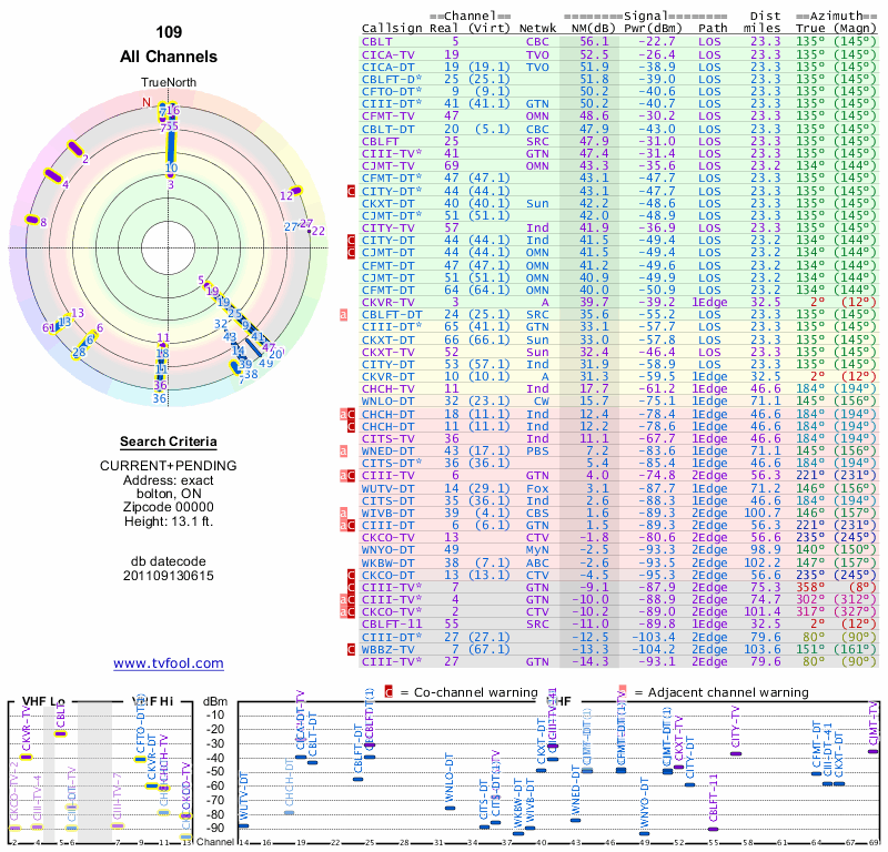 Here are the results for your location. The transmitter database was last updated on June 7, 2013. For more information about these plots and how to interpret them, please check out the Signal Analysis FAQ.
