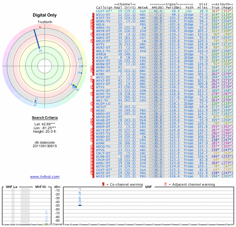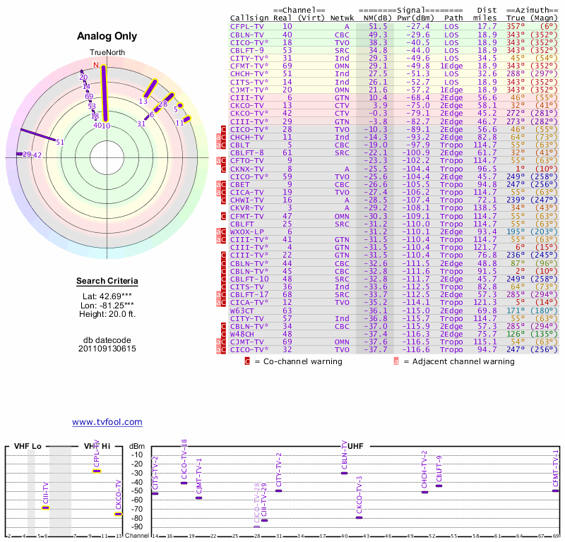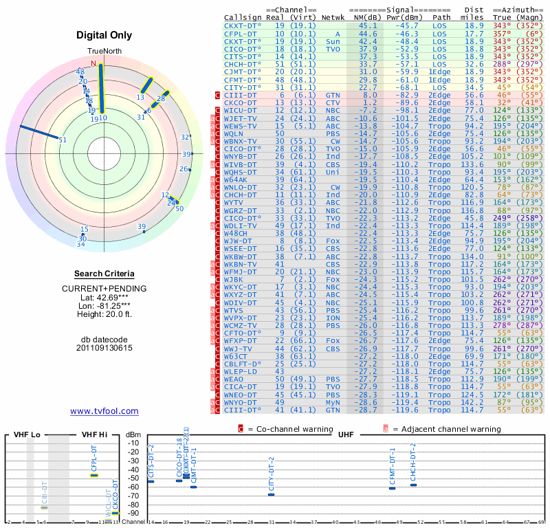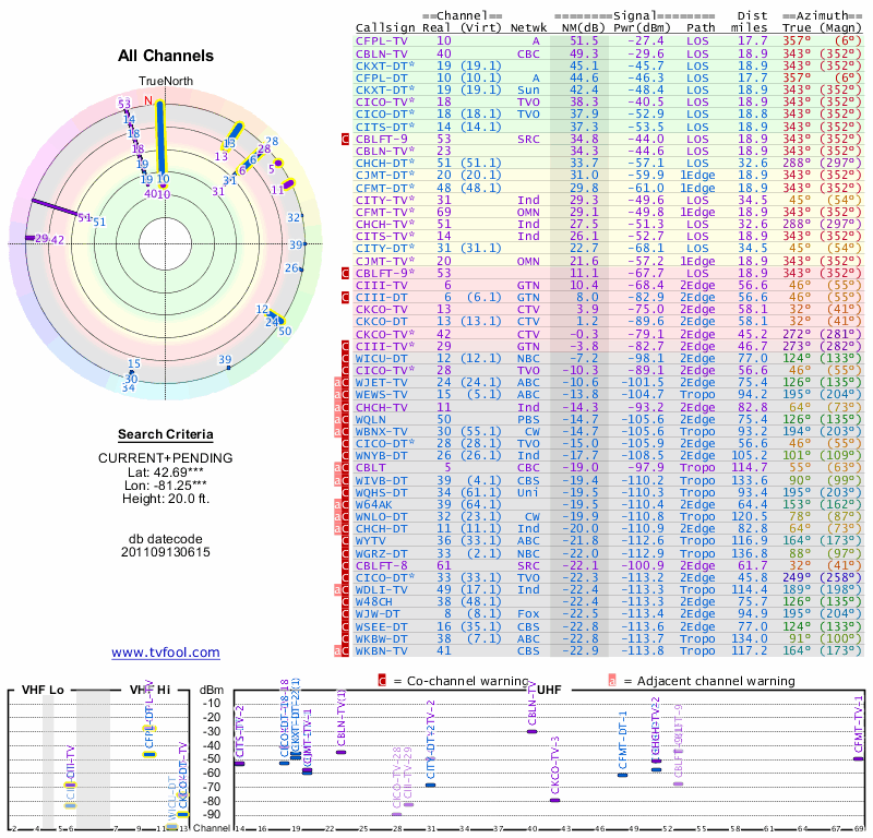Here are the results for your location. The transmitter database was last updated on June 7, 2013. For more information about these plots and how to interpret them, please check out the Signal Analysis FAQ.