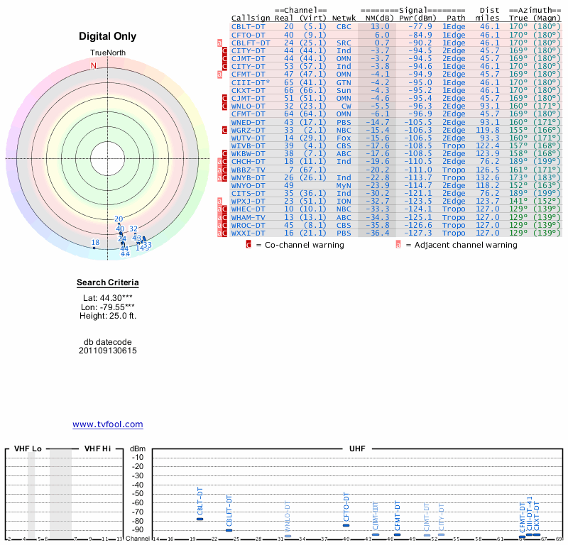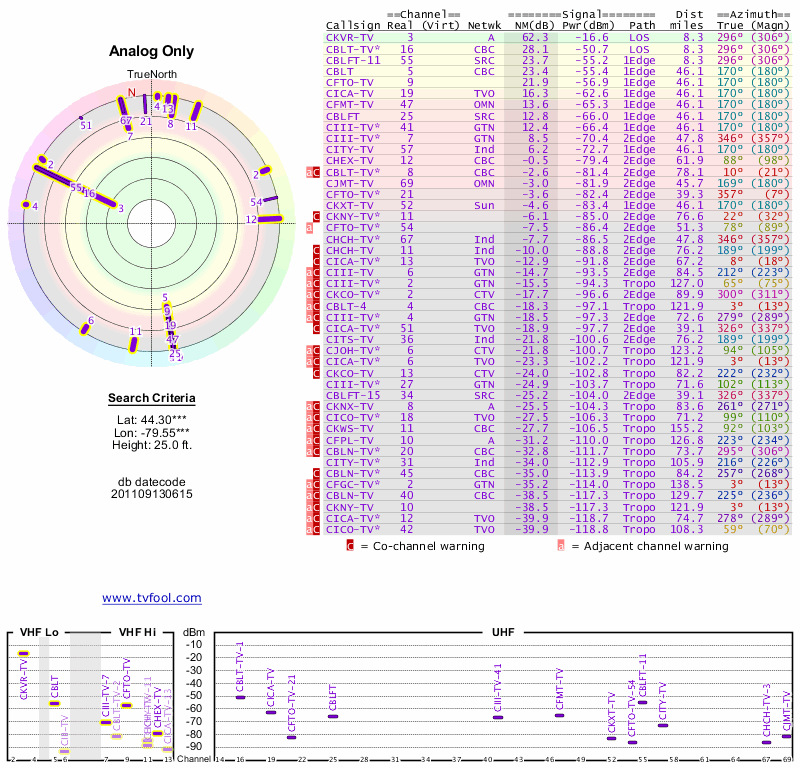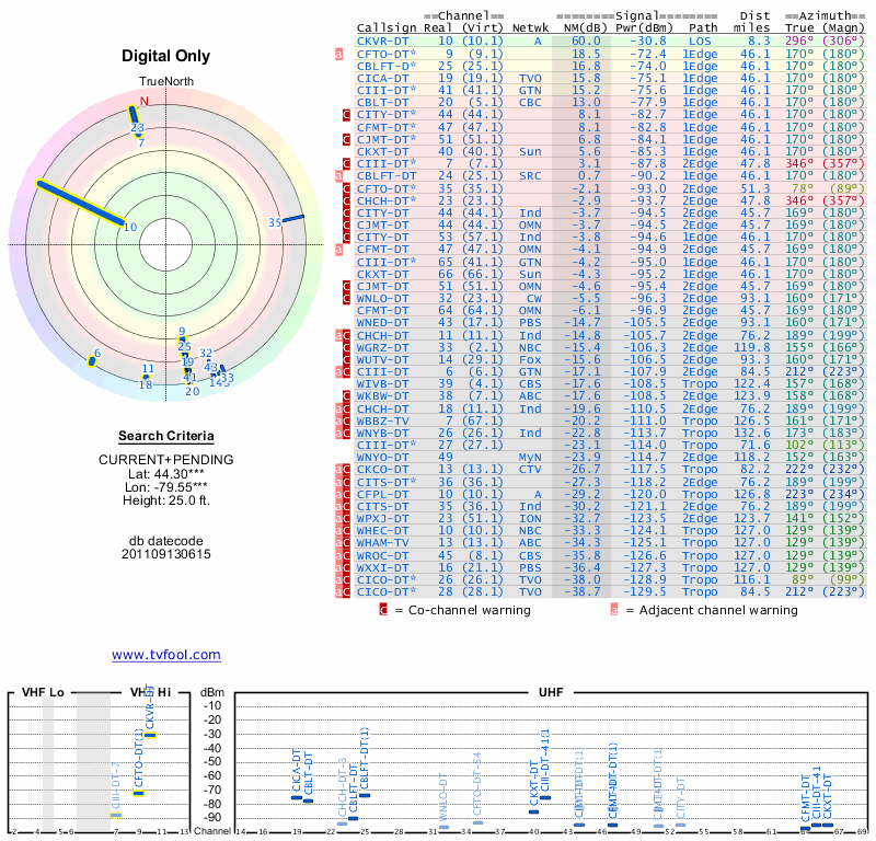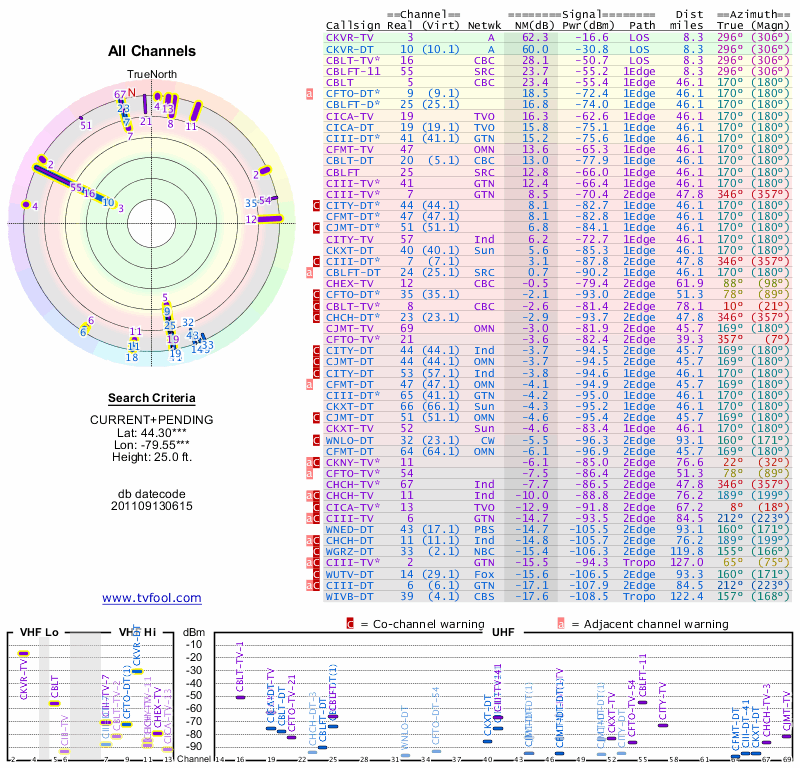 Here are the results for your location. The transmitter database was last updated on June 7, 2013. For more information about these plots and how to interpret them, please check out the Signal Analysis FAQ.