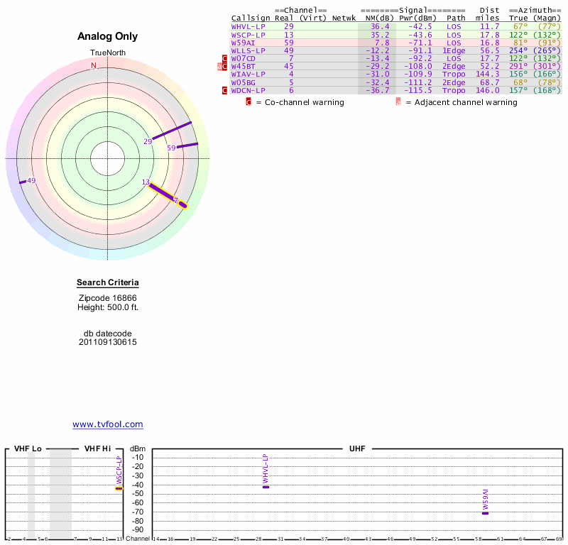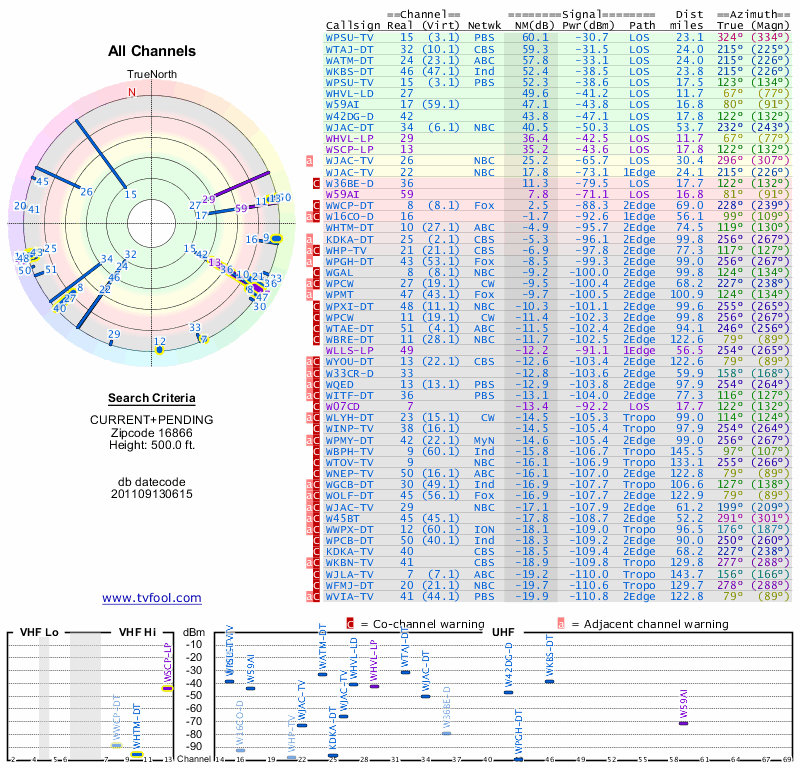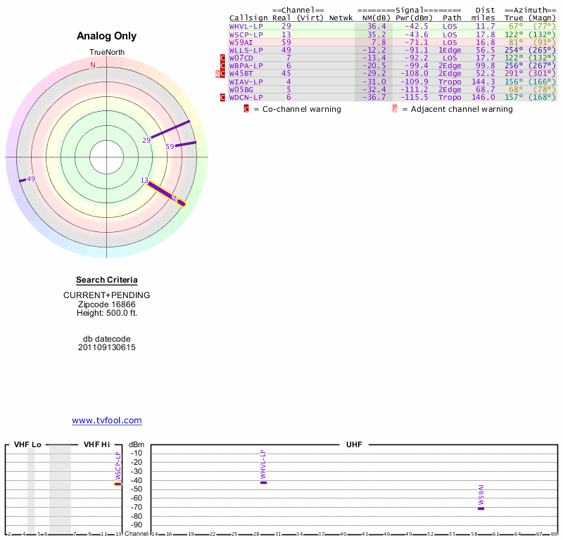 Here are the results for your location. The transmitter database was last updated on June 7, 2013. For more information about these plots and how to interpret them, please check out the Signal Analysis FAQ.