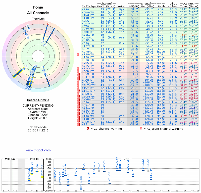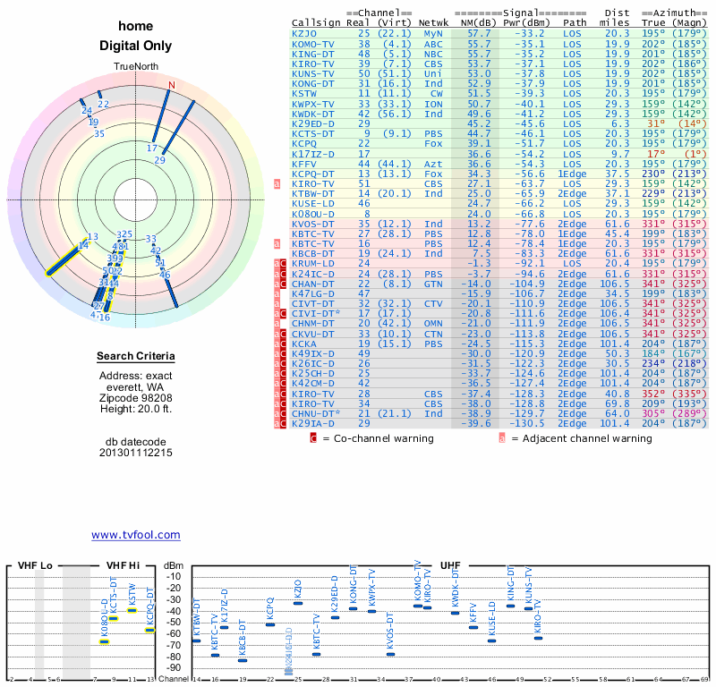 Here are the results for your location. The transmitter database was last updated on June 7, 2013. For more information about these plots and how to interpret them, please check out the Signal Analysis FAQ.