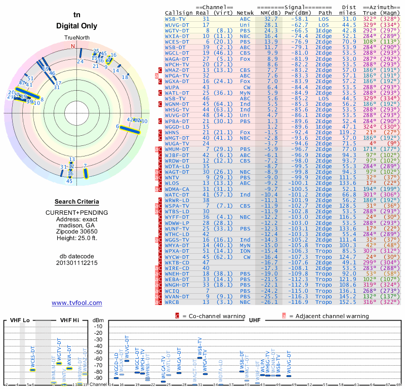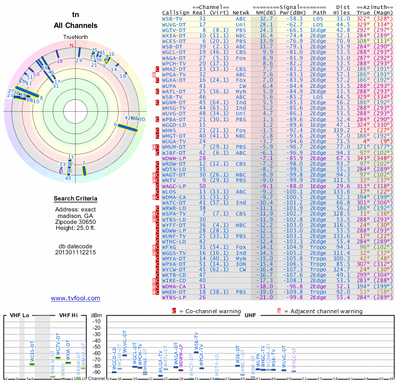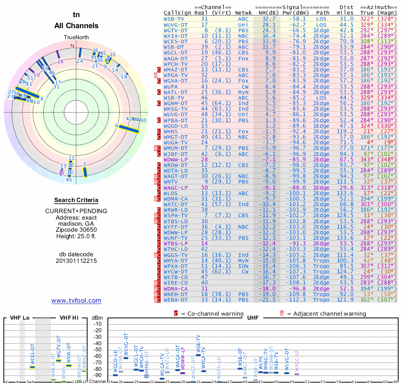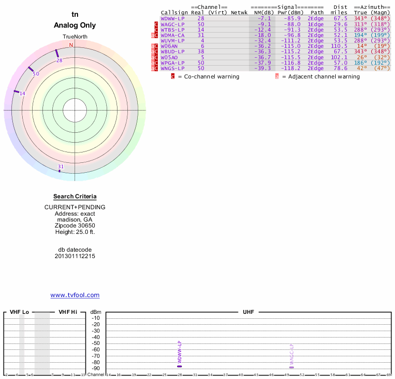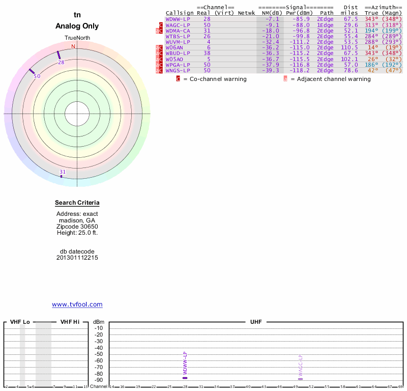 Here are the results for your location. The transmitter database was last updated on June 7, 2013. For more information about these plots and how to interpret them, please check out the Signal Analysis FAQ.