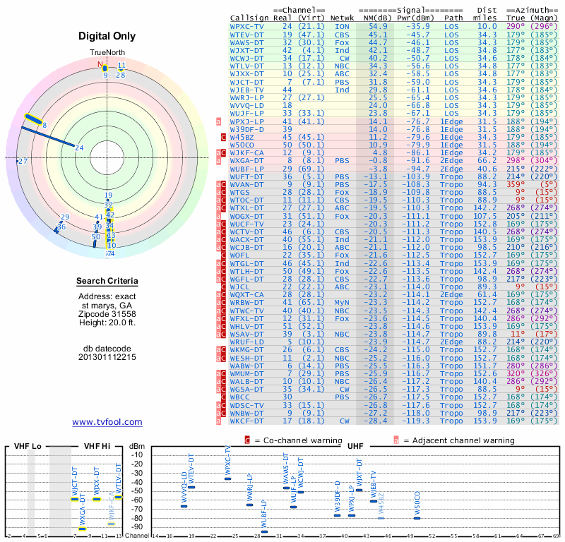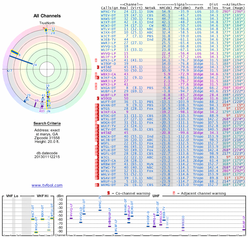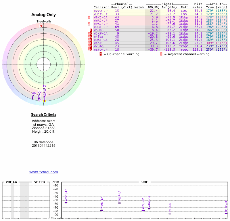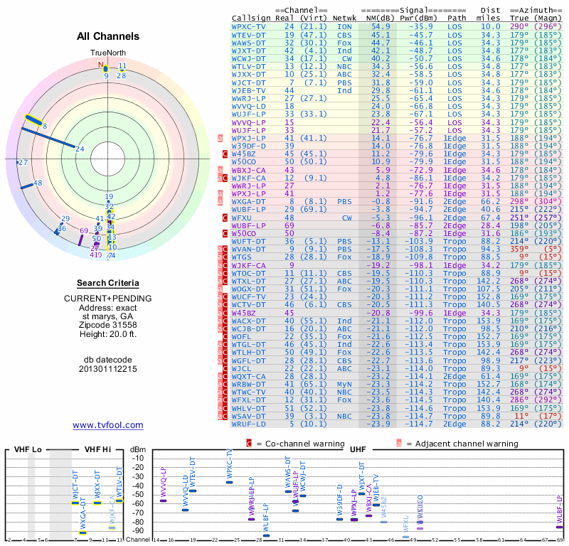 Here are the results for your location. The transmitter database was last updated on June 7, 2013. For more information about these plots and how to interpret them, please check out the Signal Analysis FAQ.