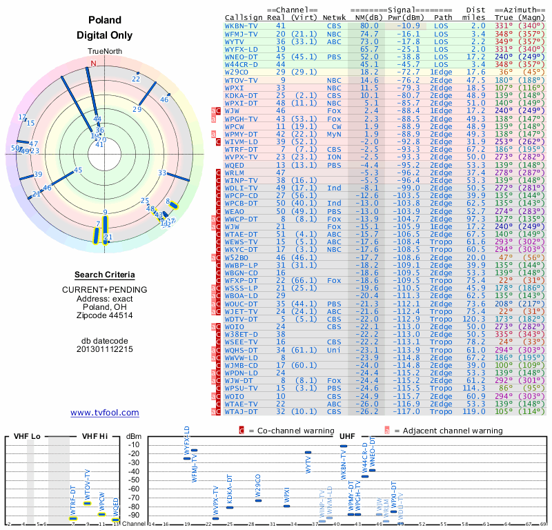 Here are the results for your location. The transmitter database was last updated on June 7, 2013. For more information about these plots and how to interpret them, please check out the Signal Analysis FAQ.