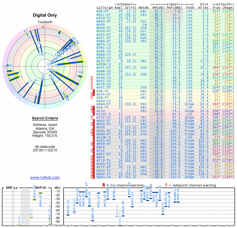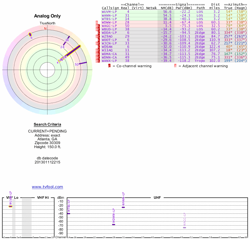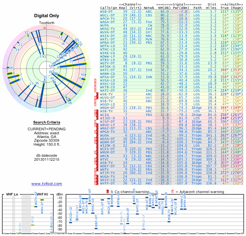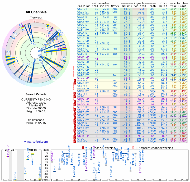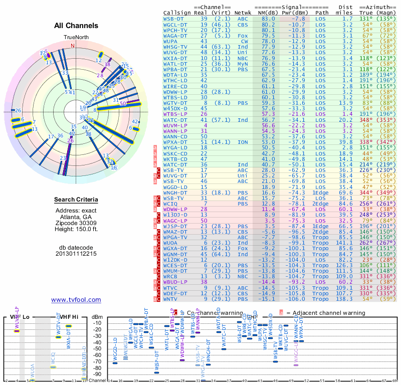 Here are the results for your location. The transmitter database was last updated on June 7, 2013. For more information about these plots and how to interpret them, please check out the Signal Analysis FAQ.