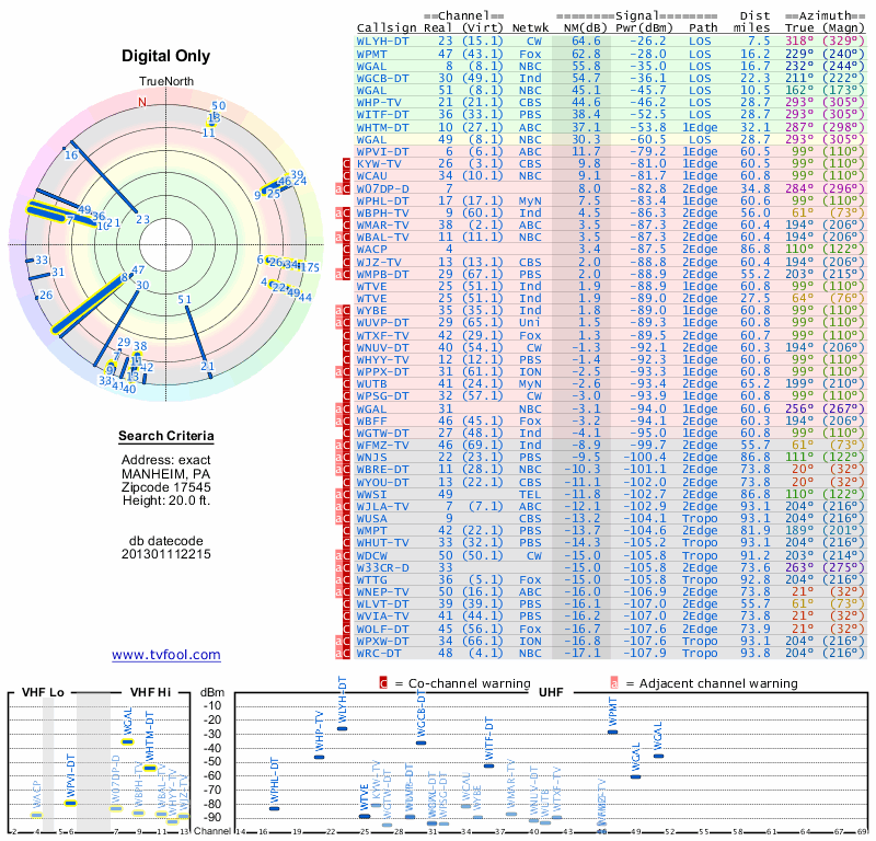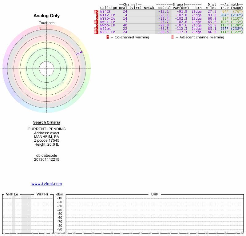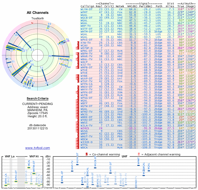 Here are the results for your location. The transmitter database was last updated on June 7, 2013. For more information about these plots and how to interpret them, please check out the Signal Analysis FAQ.