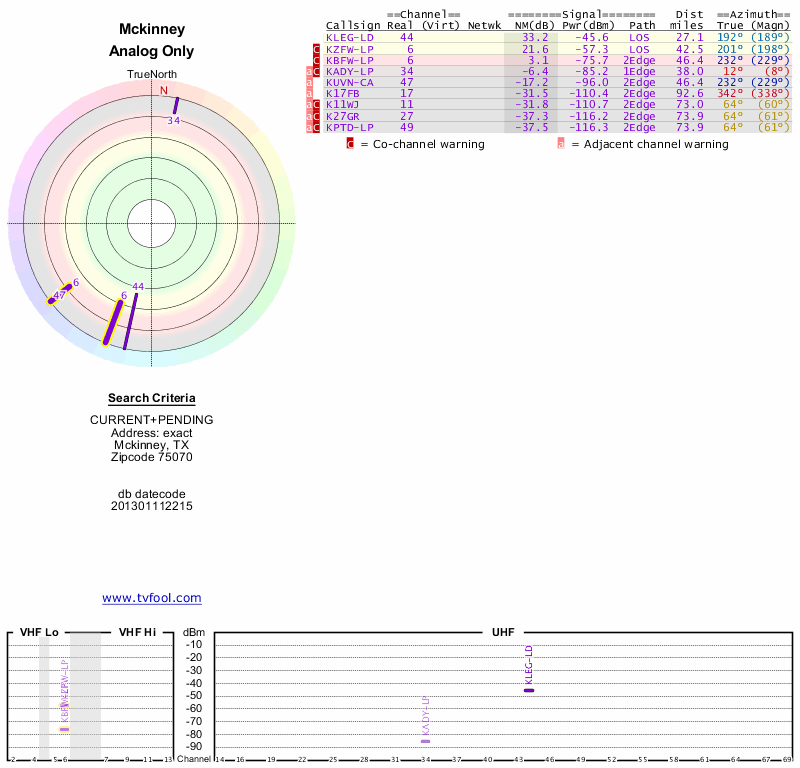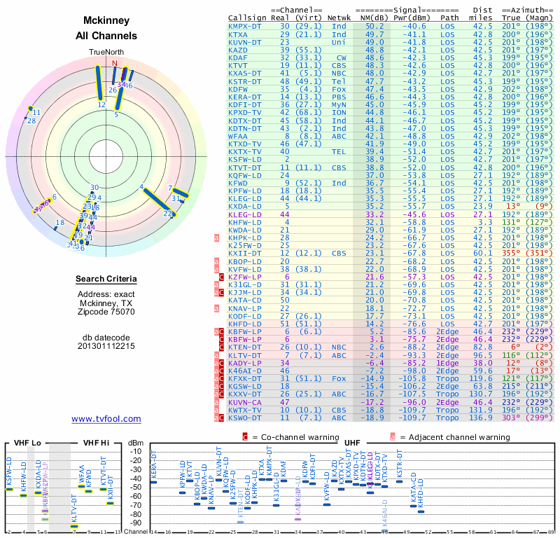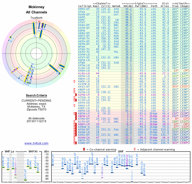 Here are the results for your location. The transmitter database was last updated on June 7, 2013. For more information about these plots and how to interpret them, please check out the Signal Analysis FAQ.