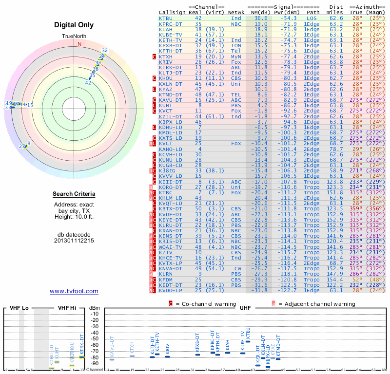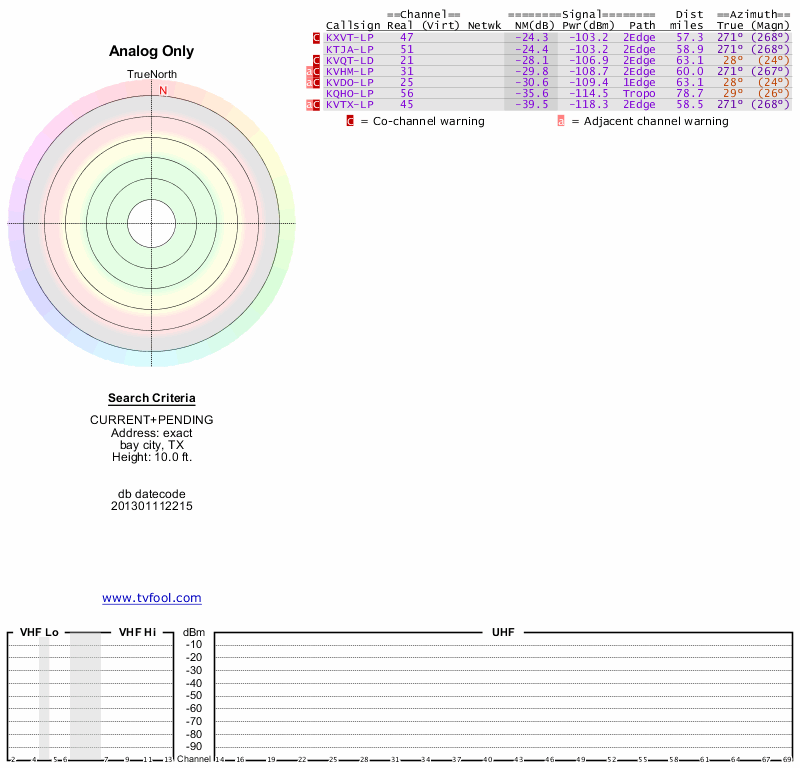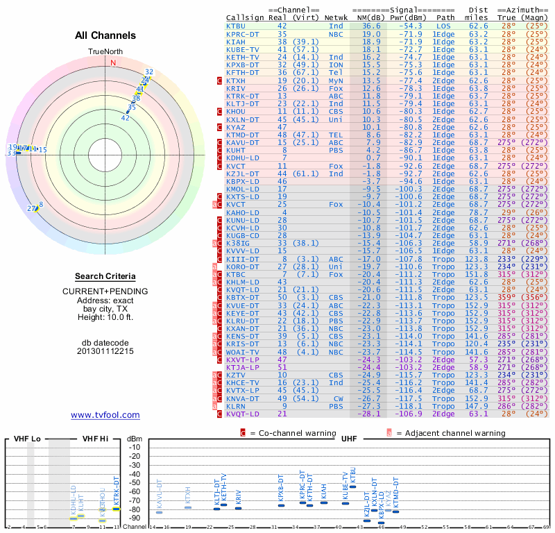 Here are the results for your location. The transmitter database was last updated on June 7, 2013. For more information about these plots and how to interpret them, please check out the Signal Analysis FAQ.
