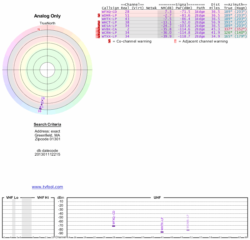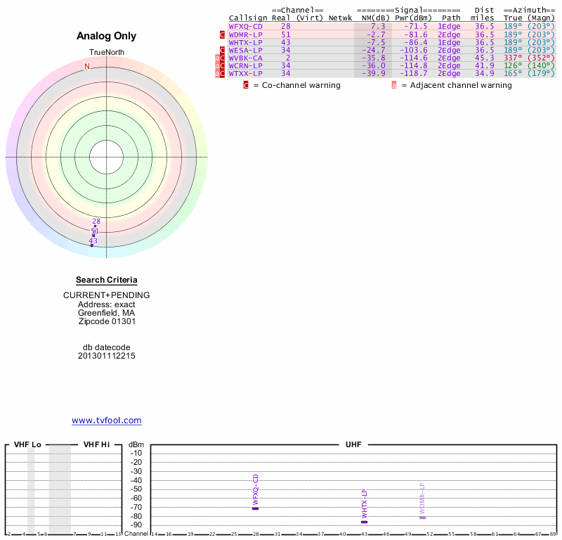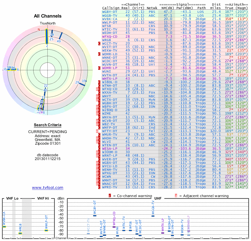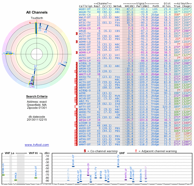 Here are the results for your location. The transmitter database was last updated on June 7, 2013. For more information about these plots and how to interpret them, please check out the Signal Analysis FAQ.