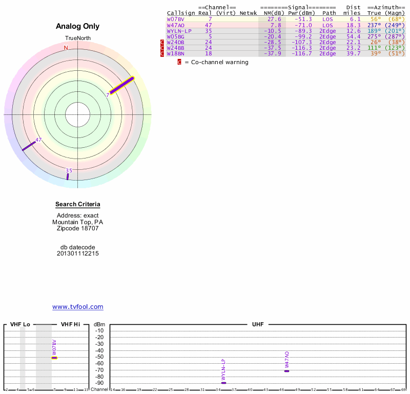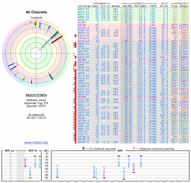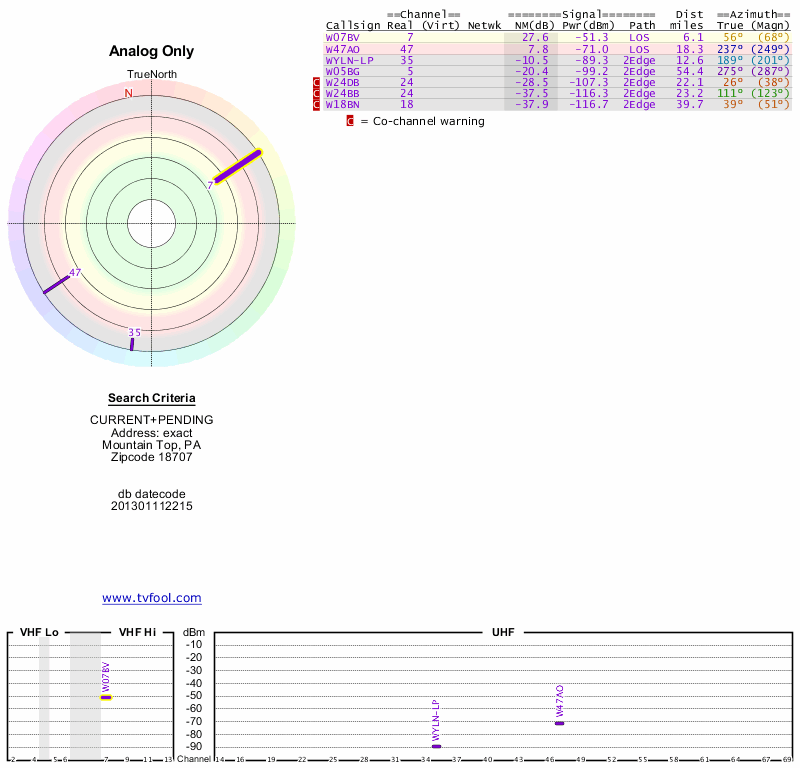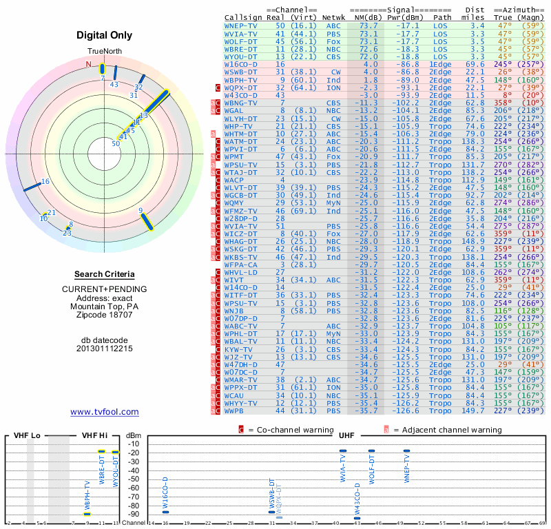 Here are the results for your location. The transmitter database was last updated on June 7, 2013. For more information about these plots and how to interpret them, please check out the Signal Analysis FAQ.