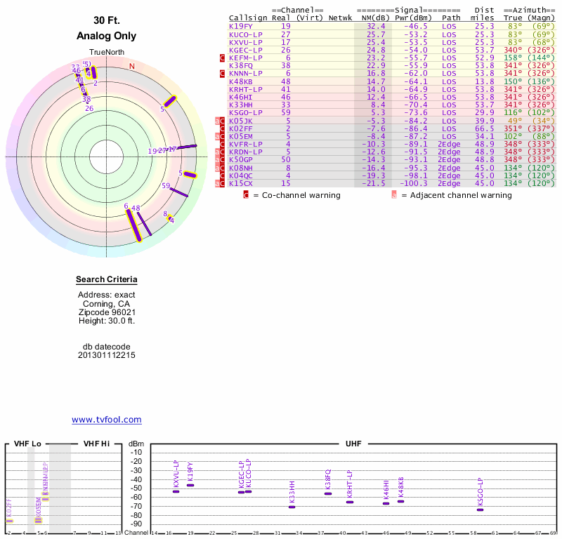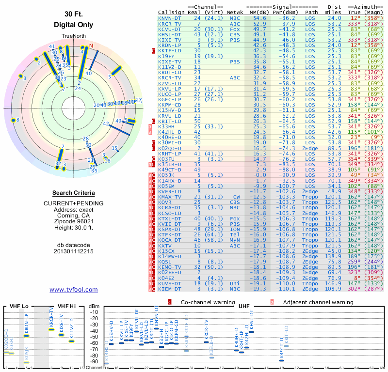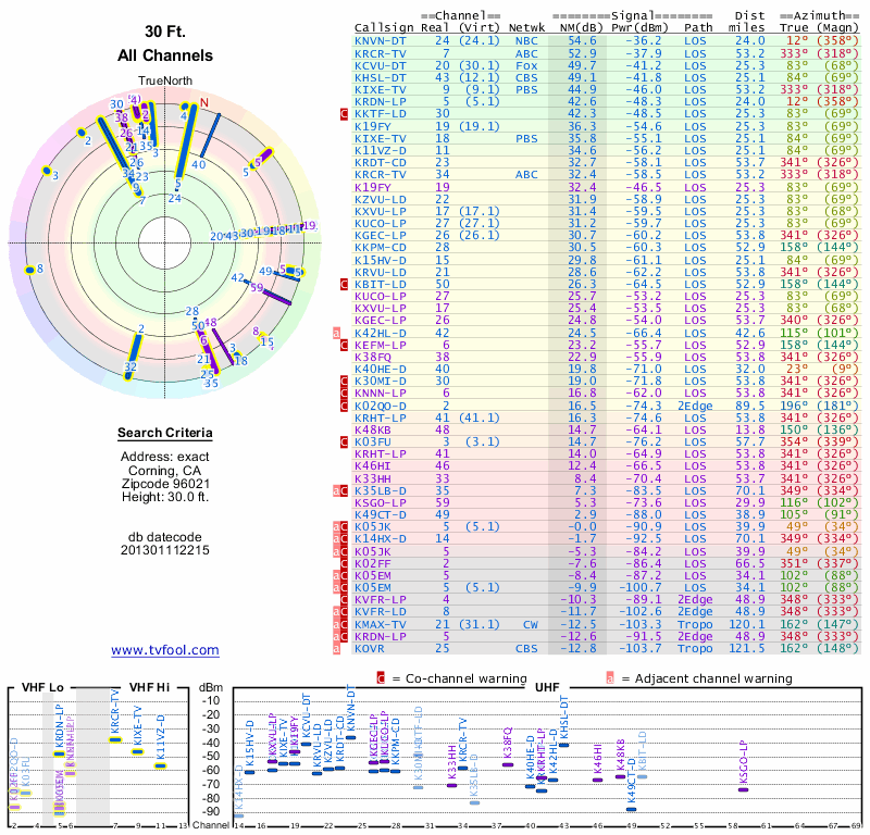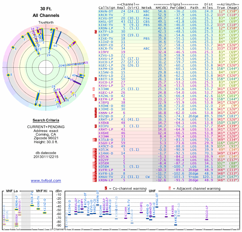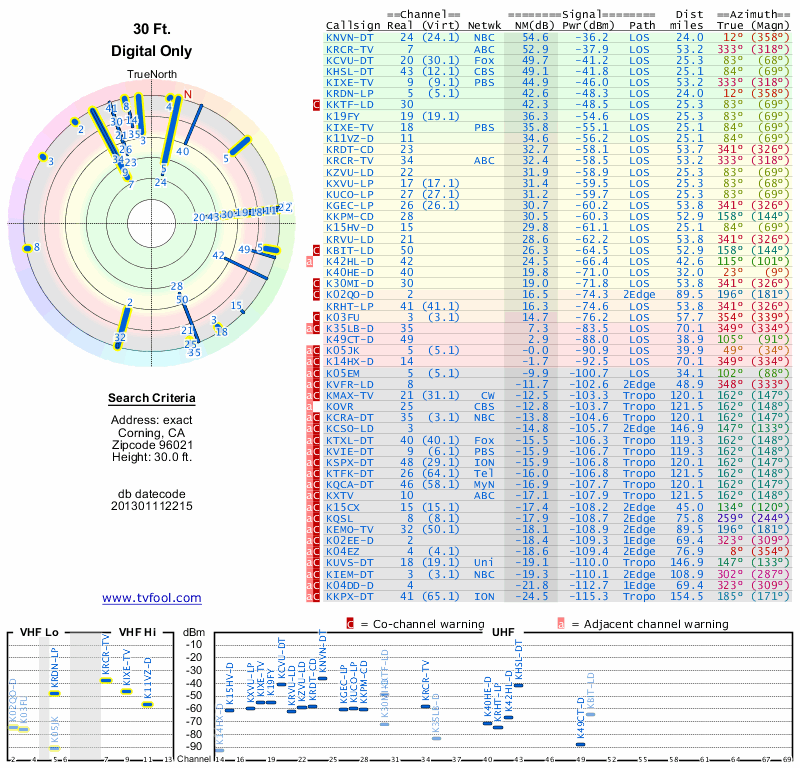Here are the results for your location. The transmitter database was last updated on June 7, 2013. For more information about these plots and how to interpret them, please check out the Signal Analysis FAQ.