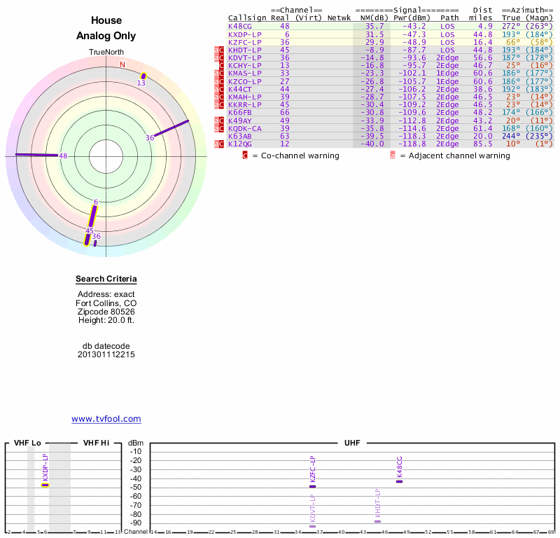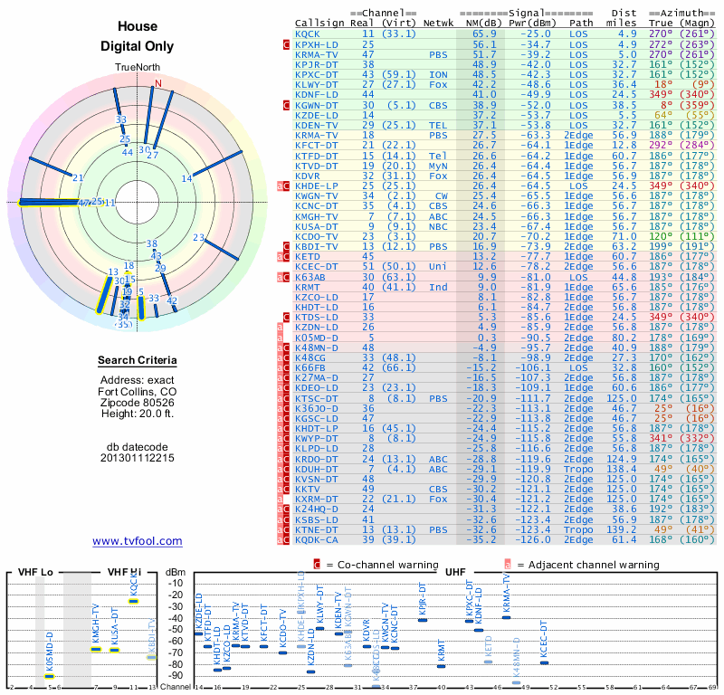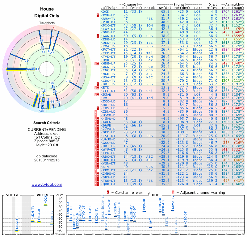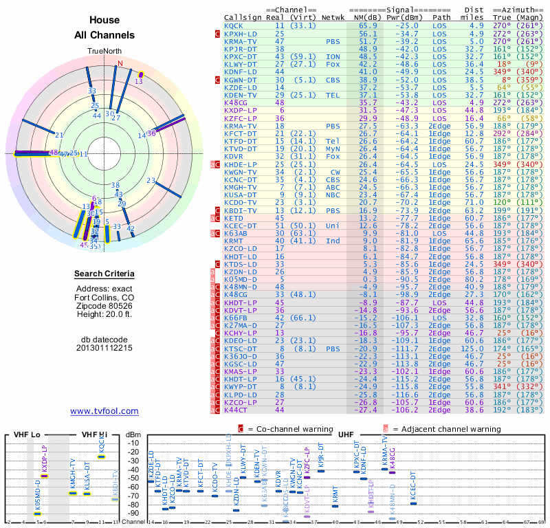 Here are the results for your location. The transmitter database was last updated on June 7, 2013. For more information about these plots and how to interpret them, please check out the Signal Analysis FAQ.