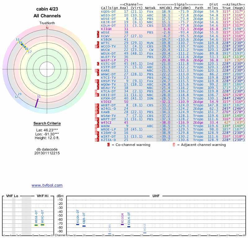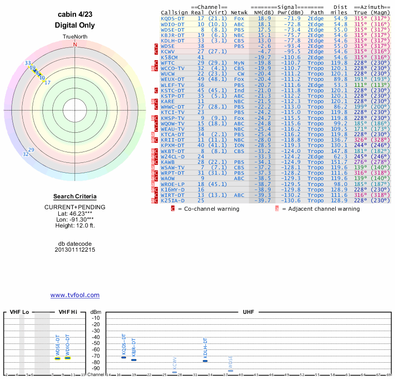 Here are the results for your location. The transmitter database was last updated on June 7, 2013. For more information about these plots and how to interpret them, please check out the Signal Analysis FAQ.