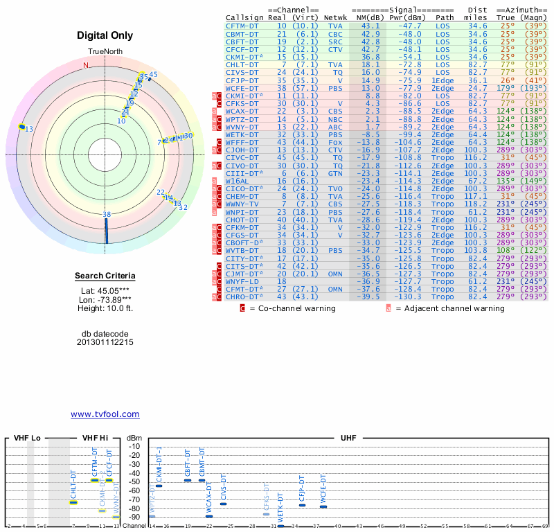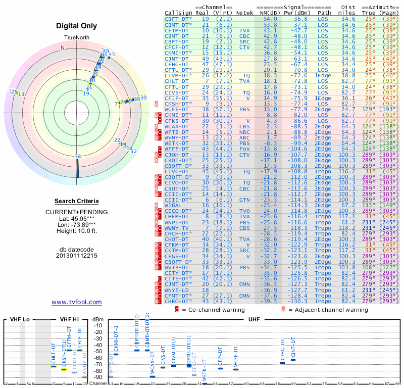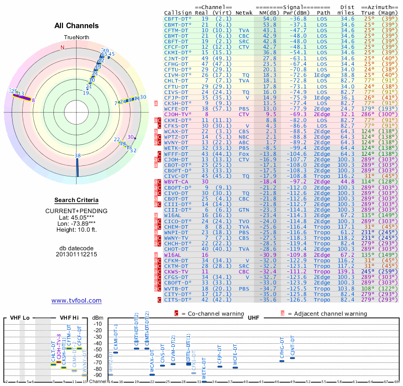 Here are the results for your location. The transmitter database was last updated on June 7, 2013. For more information about these plots and how to interpret them, please check out the Signal Analysis FAQ.