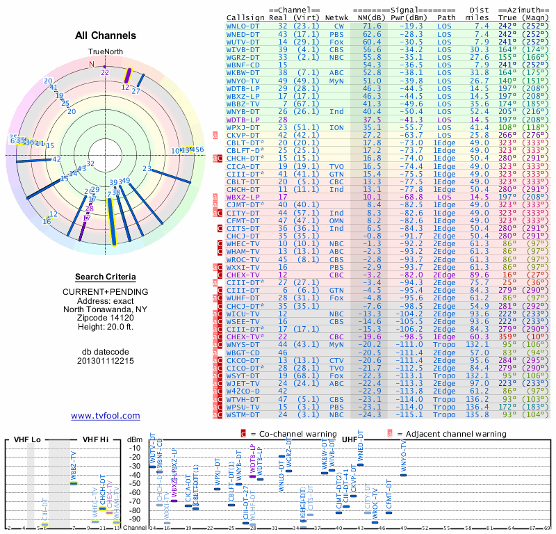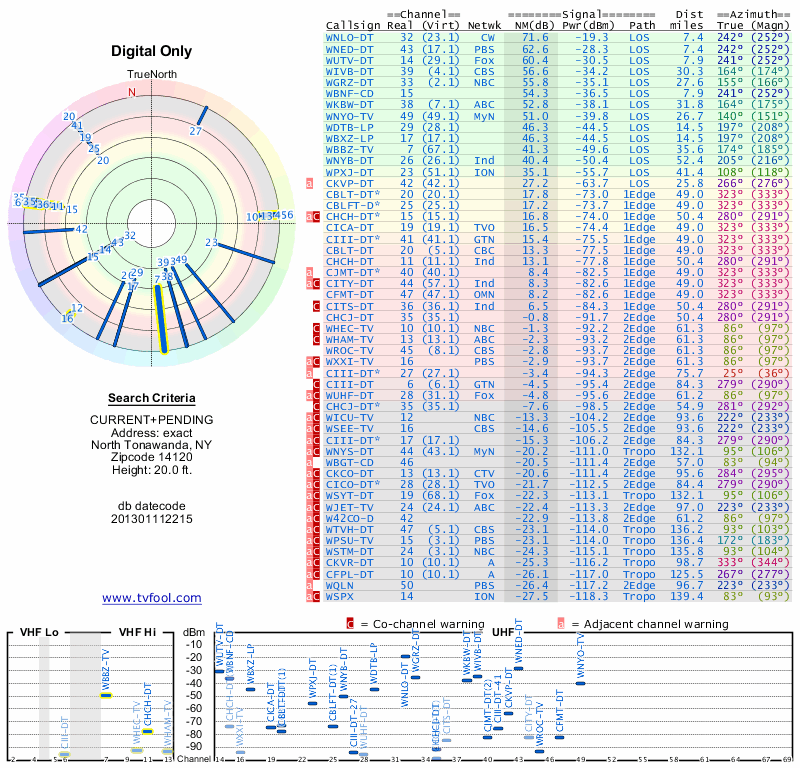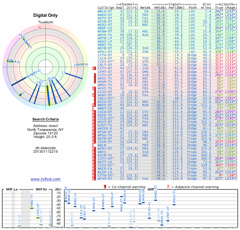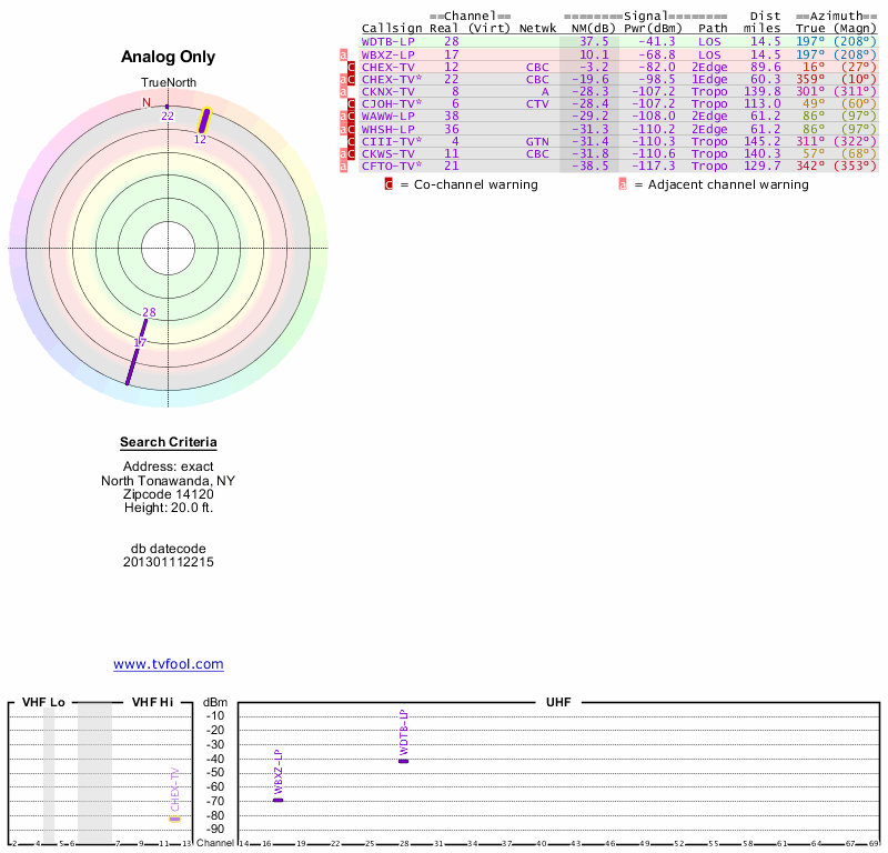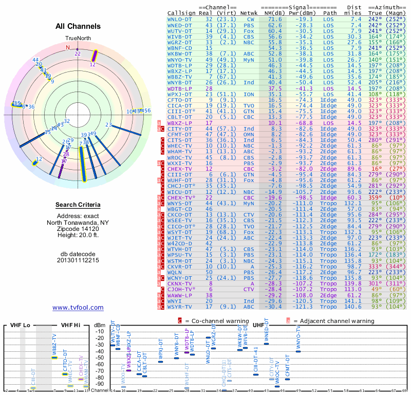 Here are the results for your location. The transmitter database was last updated on June 7, 2013. For more information about these plots and how to interpret them, please check out the Signal Analysis FAQ.
