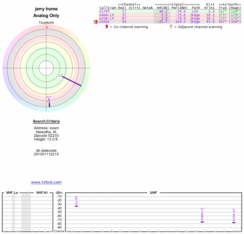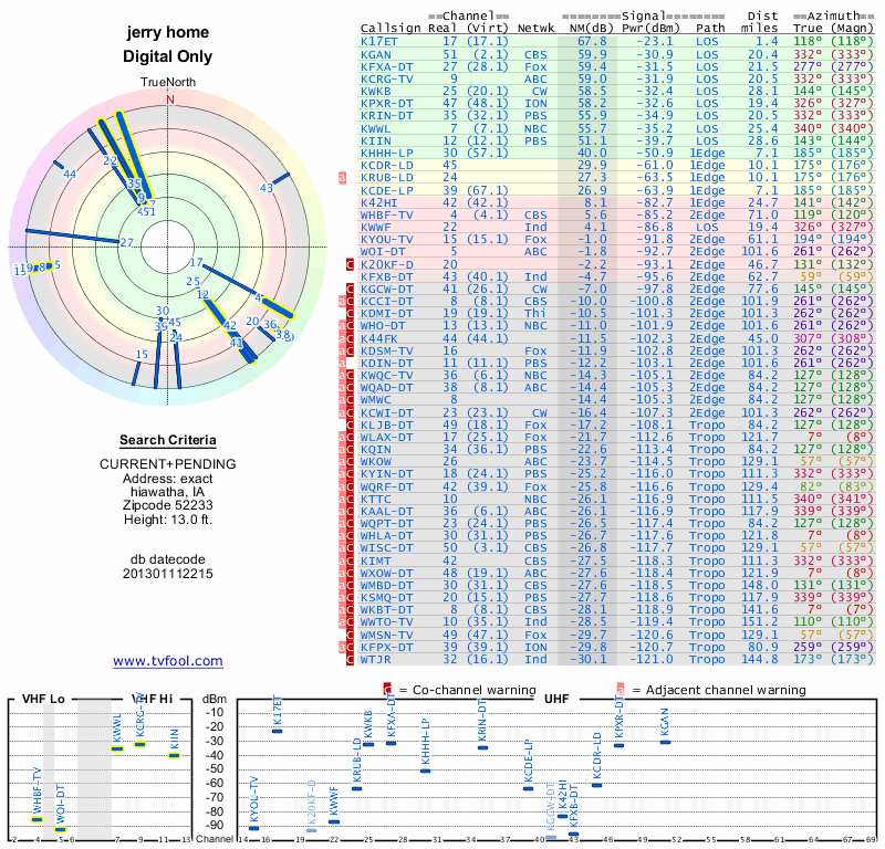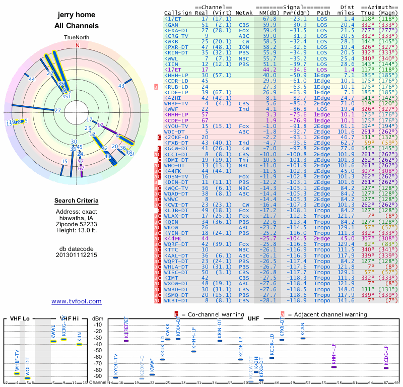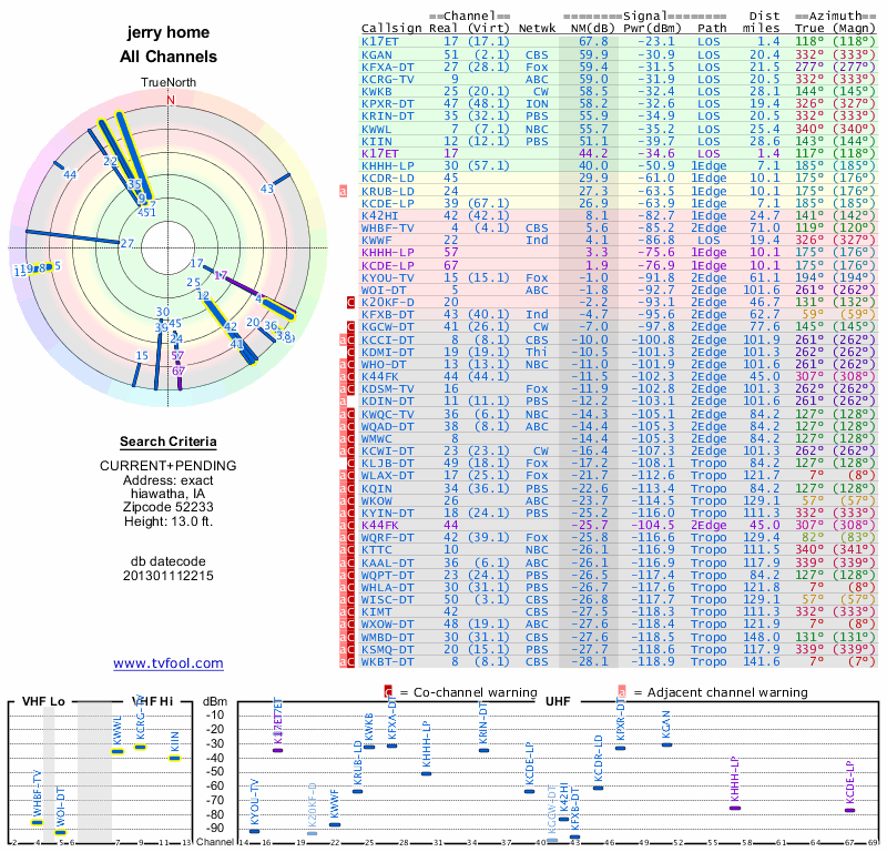 Here are the results for your location. The transmitter database was last updated on June 7, 2013. For more information about these plots and how to interpret them, please check out the Signal Analysis FAQ.