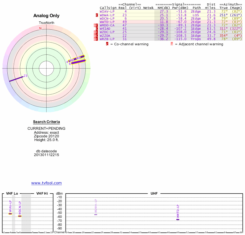Here are the results for your location. The transmitter database was last updated on June 7, 2013. For more information about these plots and how to interpret them, please check out the Signal Analysis FAQ.