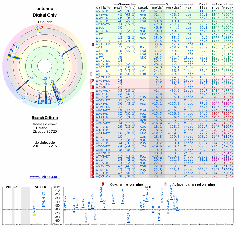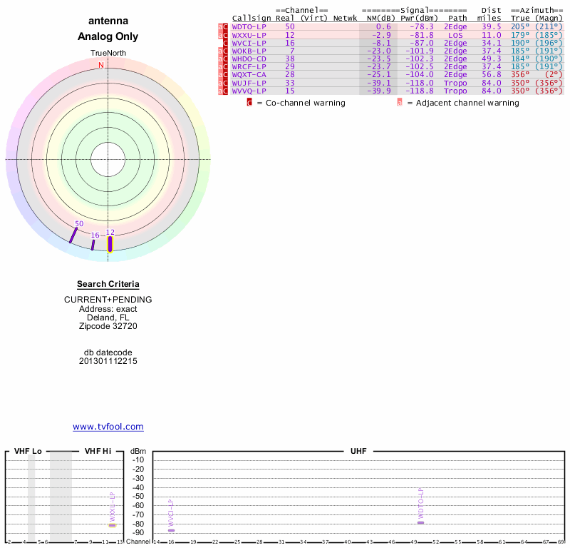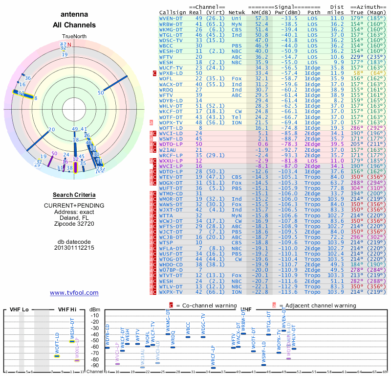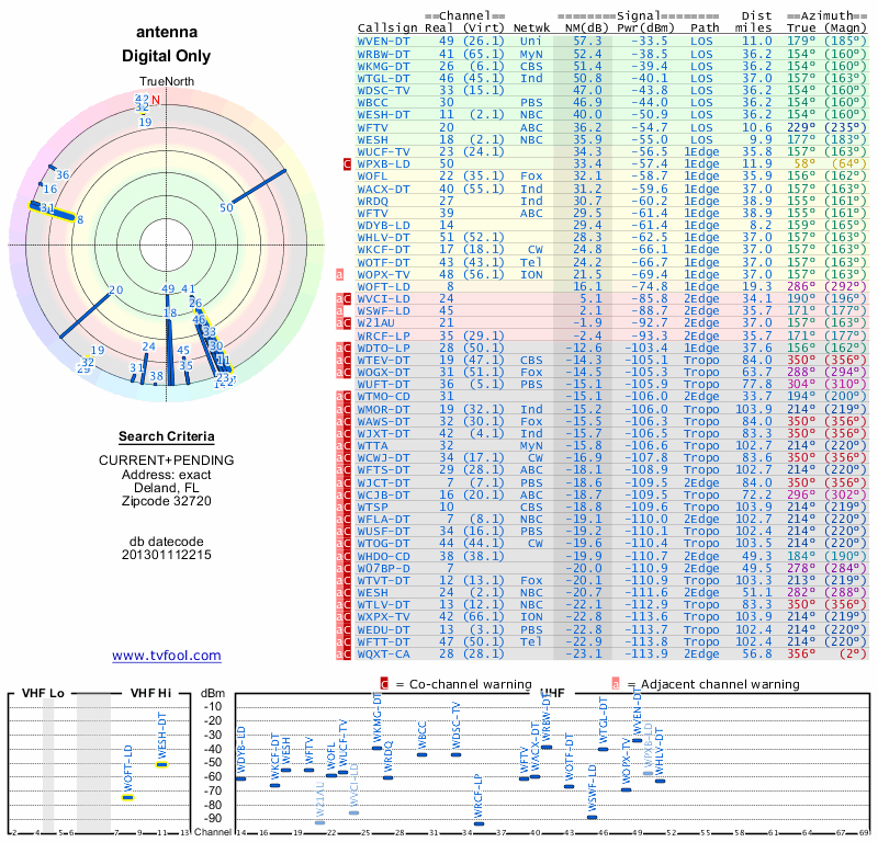 Here are the results for your location. The transmitter database was last updated on June 7, 2013. For more information about these plots and how to interpret them, please check out the Signal Analysis FAQ.